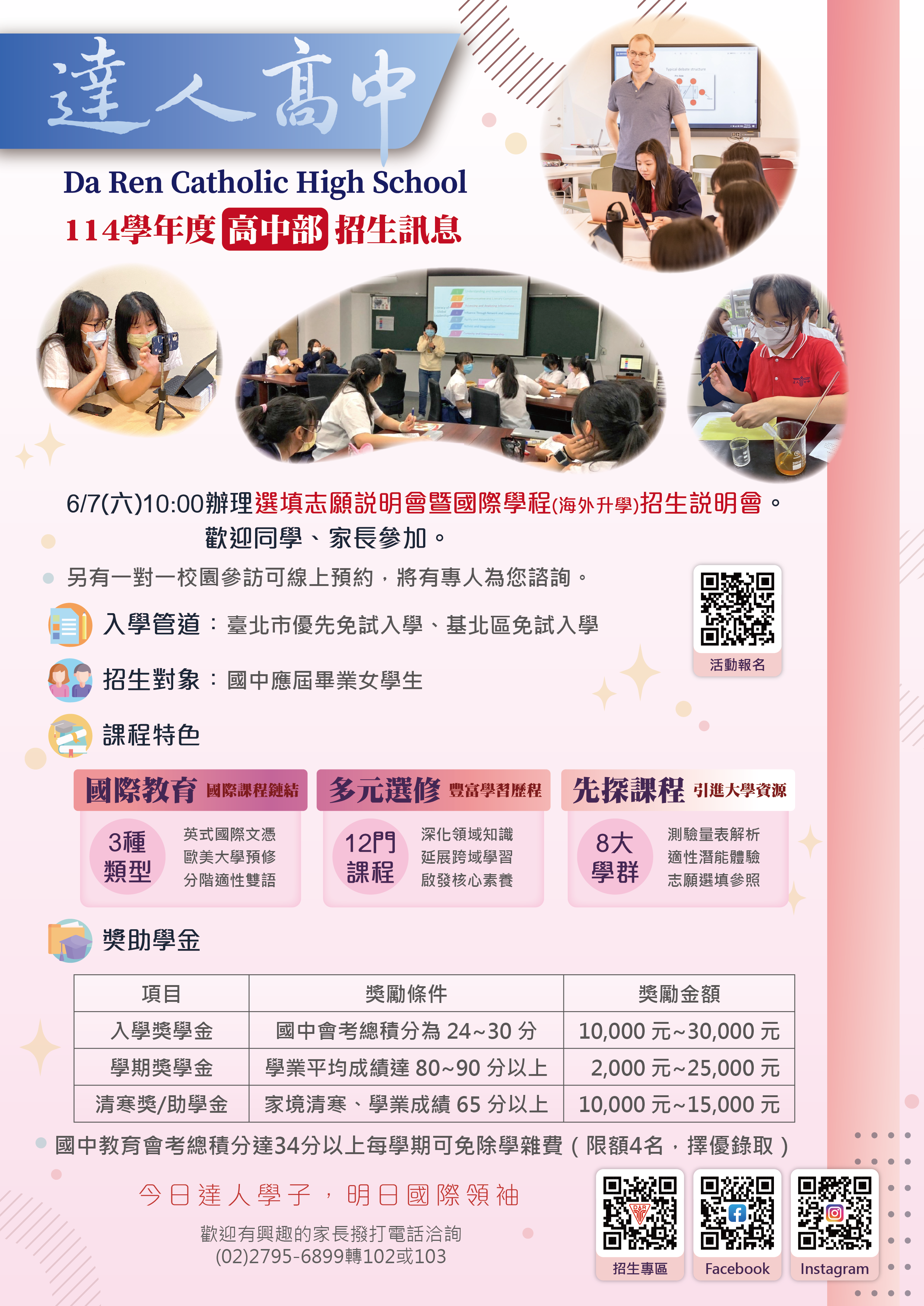 三、本校訂於6月7日(星期六)上午10時辦理志願選填說明會 暨國際學程(海外升學)招生說明會,歡迎九年級女學生及 家長踴躍報名參加,活動報名連結:https://reurl.cc /vQLzll。