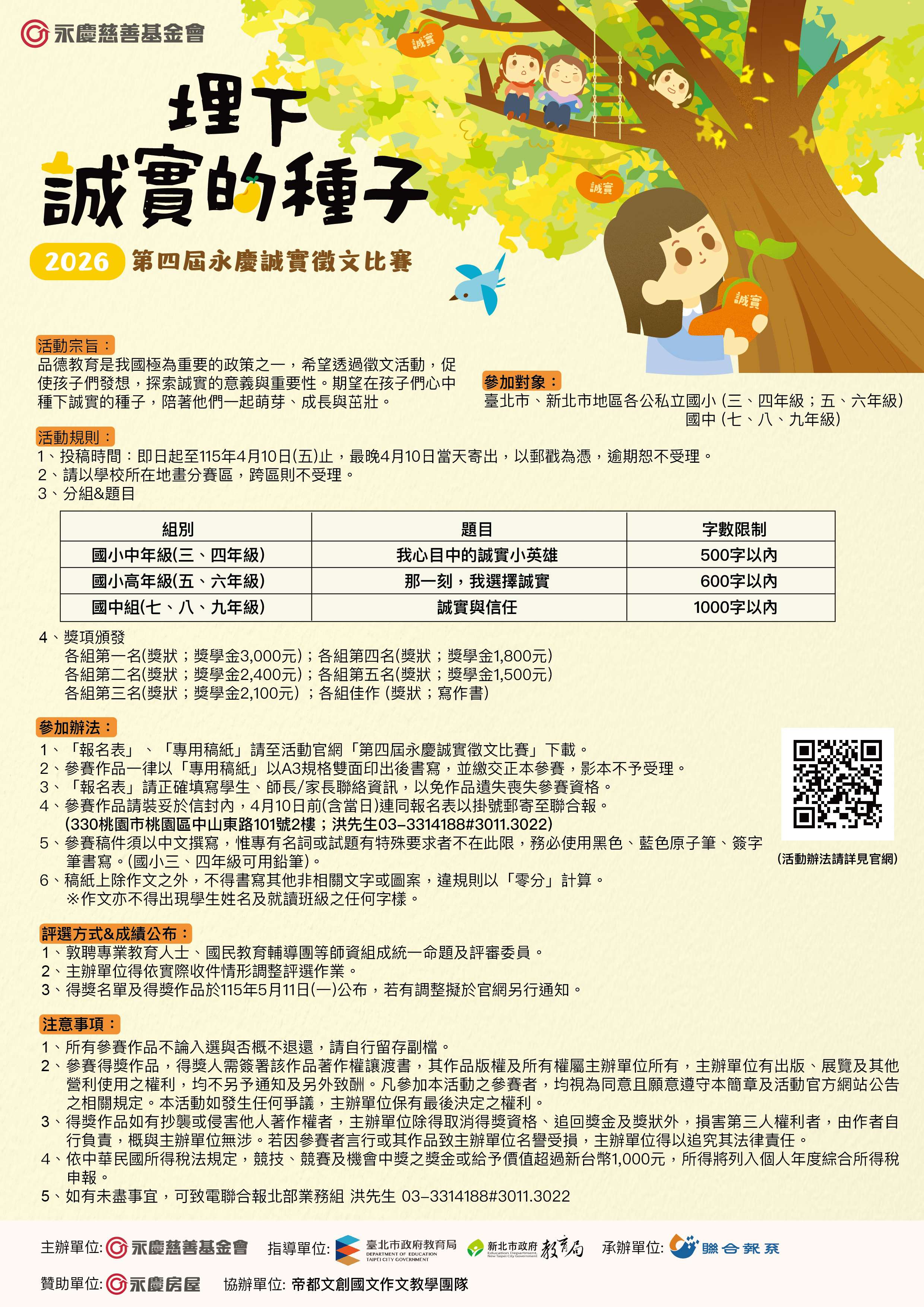 轉知-2026「第四屆永慶誠實徵文活動」實施計畫、簡章、海報、報名表及專用稿紙