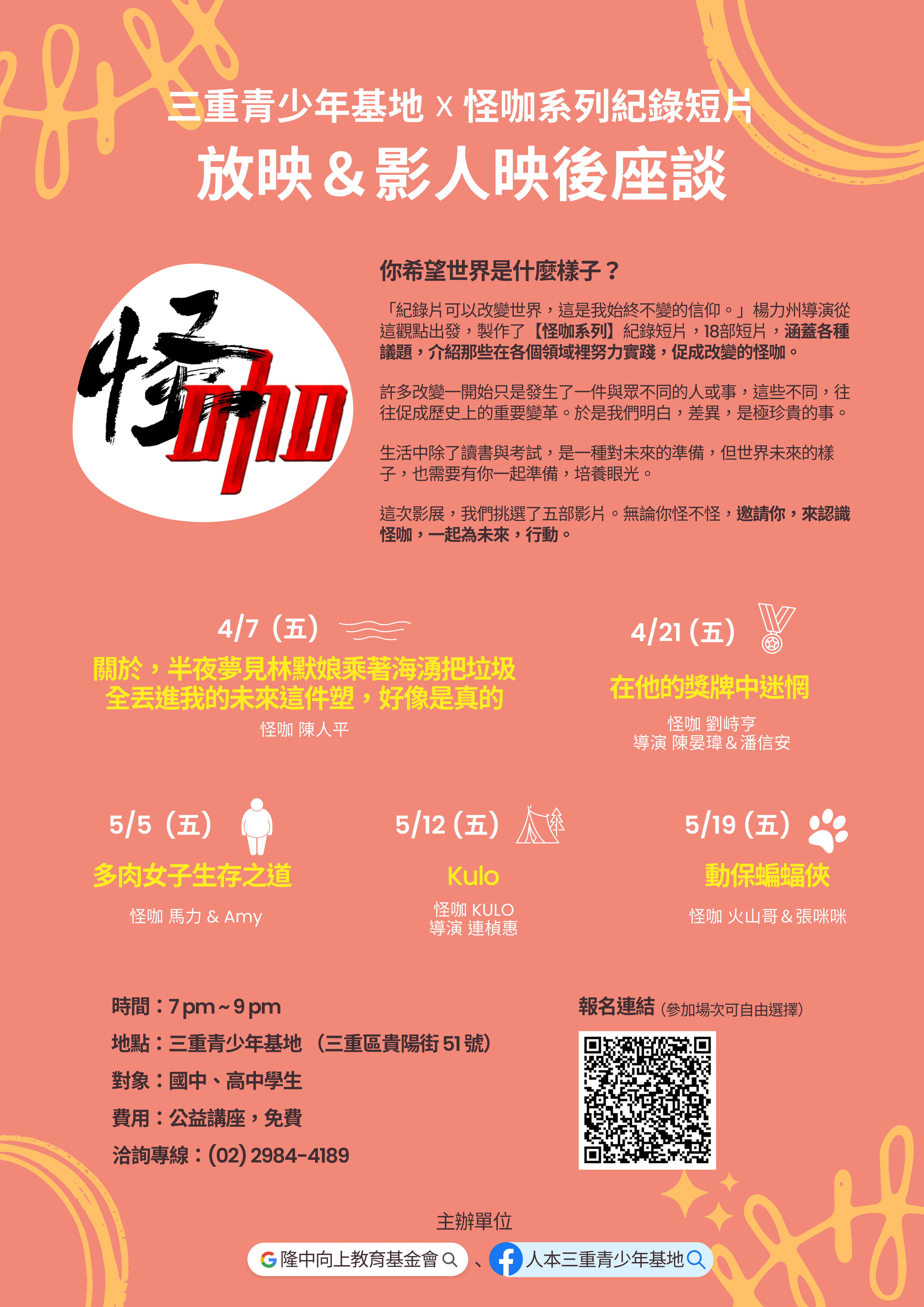 一、人本教育基金會三重青少年基地與隆中向上基金會合作,舉辦五場怪咖系列紀錄短片放映與座談,影片放映後,邀請影片主角、導演進行座談,內容包含環保、動保、性別等社會倡議與自我探索等議題討論,場次可單選或多選。