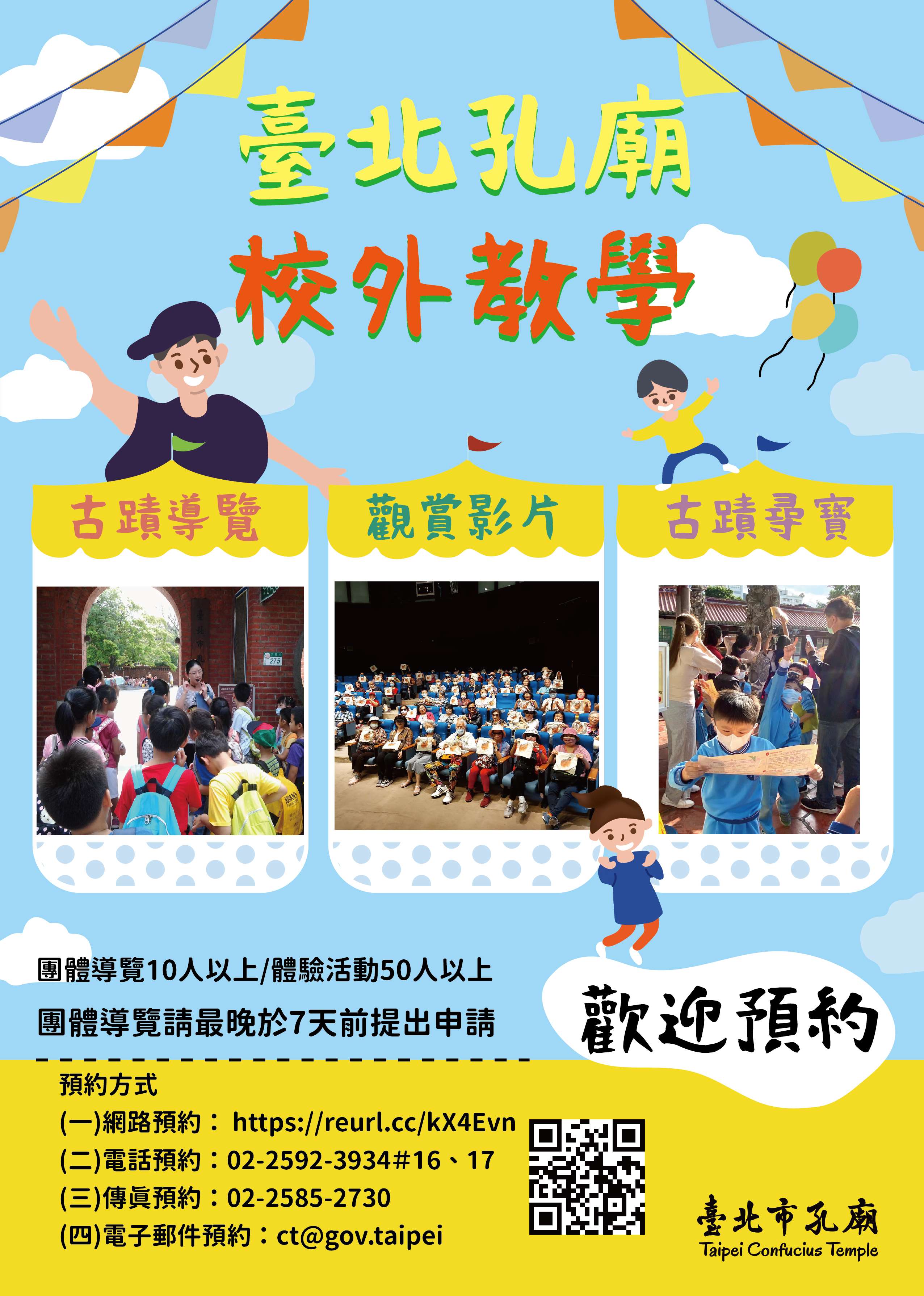二、直轄市定古蹟臺北孔廟擁有豐富之儒學底蘊,提供團體導覽、觀賞影片、體驗活動等服務,符合新課綱素養導向、相關領域強調溝通互動、藝術涵養與美感素養之培養。