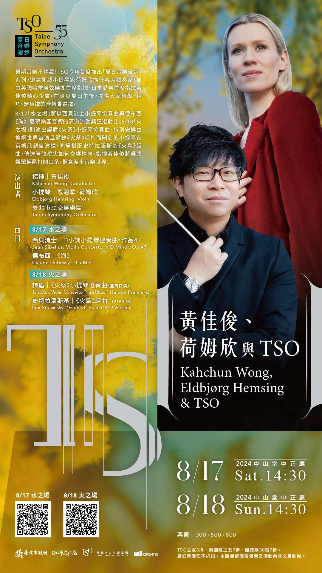 一、黃佳俊、荷姆欣與TSO (水之場、火之場)音樂會係本團 今年推出之全新【TSO夏日音樂漫步】系列活動,特別邀請 現任日本愛樂交響樂團首席指揮黃佳俊(Kahchun Wong),攜手挪威小提琴家恩碧歐·荷姆欣(Eldbjørg Hemsing)同臺演出,這次全新設計輕巧的音樂會內容,只需一段悠閒的下午茶時間,無中場休息加上指揮分享,輕鬆欣賞古典音樂,提供夏日午後另一種休閒選擇。本次音樂會公務人員享有八折優惠、學生享有購票七折優惠,歡迎蒞臨聆賞。
