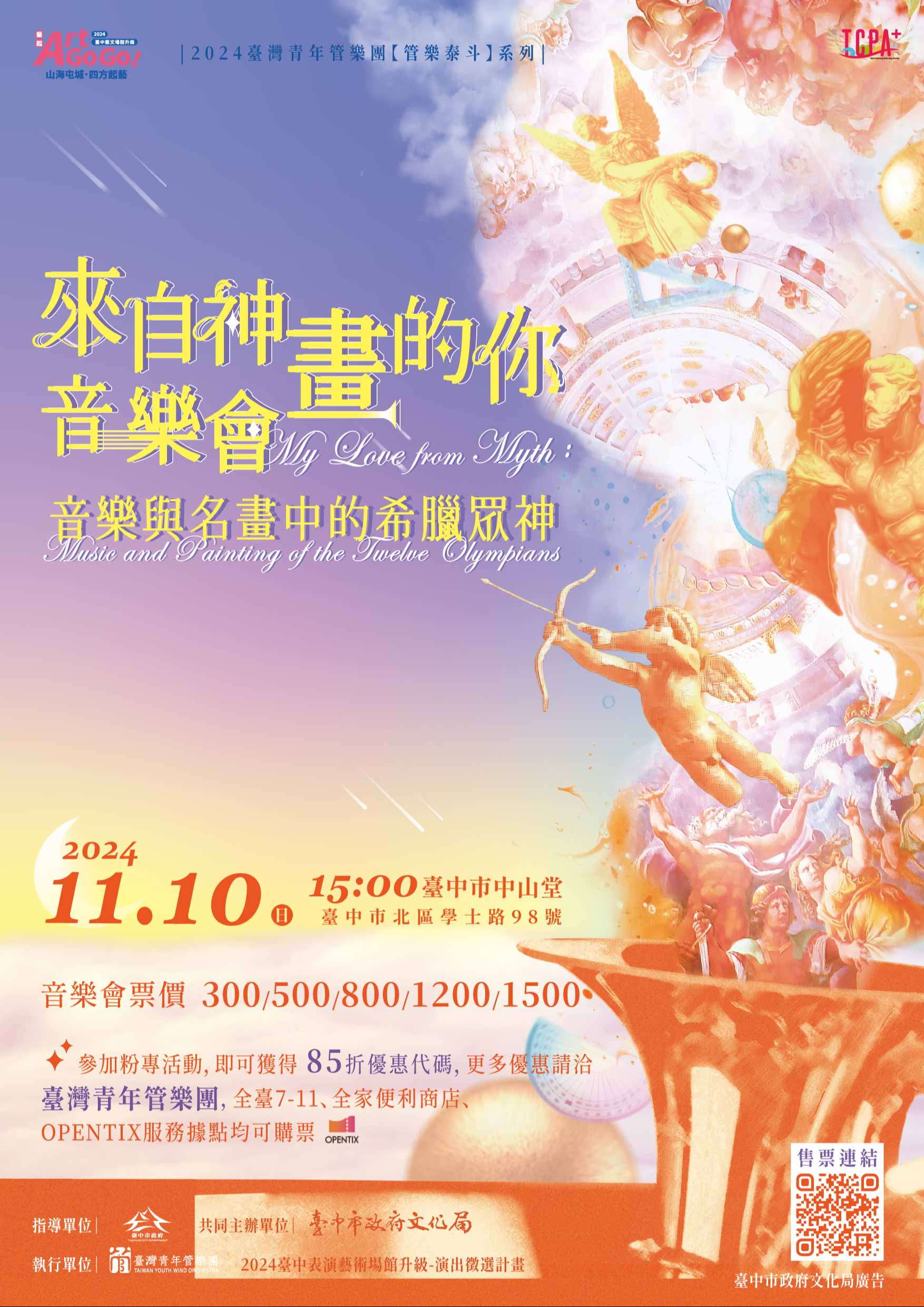 二、節目介紹:臺灣青年管樂團『管樂泰斗』系列音樂會,2024隆重呈現【來自神畫的你】音樂會-音樂與名畫中的希臘眾神,是一場融合希臘神話與西班牙作曲家奧斯卡·納瓦羅的《奧林帕斯諸神》交響組曲的音樂會。十個樂章生動描繪十二位神祗,以具挑戰性的曲目展現管樂團的卓越演奏技巧;特邀Podcaster葵花子在樂章中介紹名畫,讓觀眾更深入理解神話故事。音樂會還包含2024委託創作《甘露水音畫-永恆的剎那》交響管樂曲,致敬雕塑作品「甘露水」,誠摯邀請貴校全體師生加入這場神話與藝術的音樂旅程,一同見證奇妙的永恆剎那。
