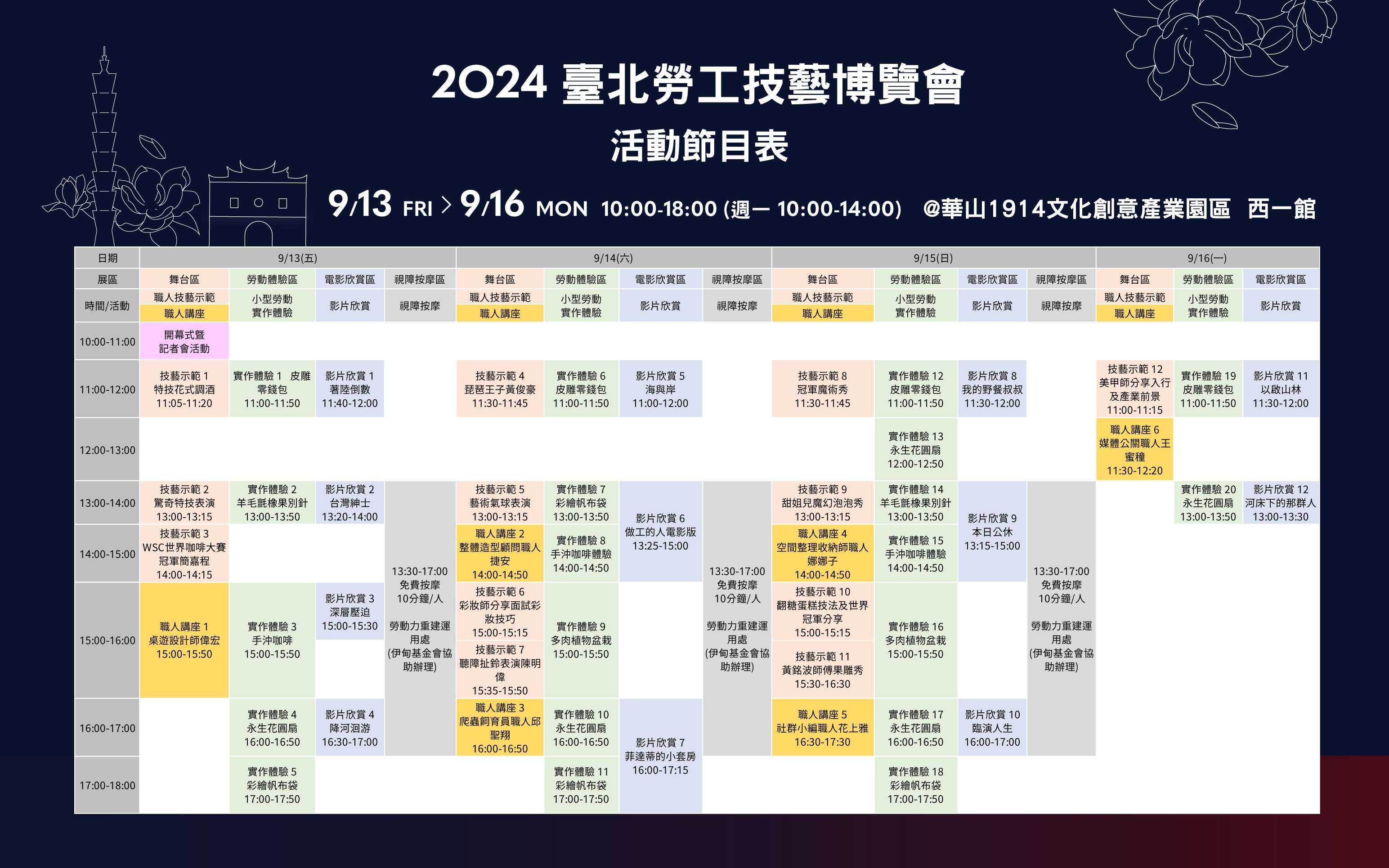 一、為傳承勞工技藝與彰顯職人精神,本局於113年9月13日至9月16日假華山文創園區西1館(臺北市中正區八德路1段1號)舉辦旨揭活動(免費入場),今年主題「技傳佰四,藝氣風發」,響應臺北建城140週年,百工職人聯袂展現超高技藝。