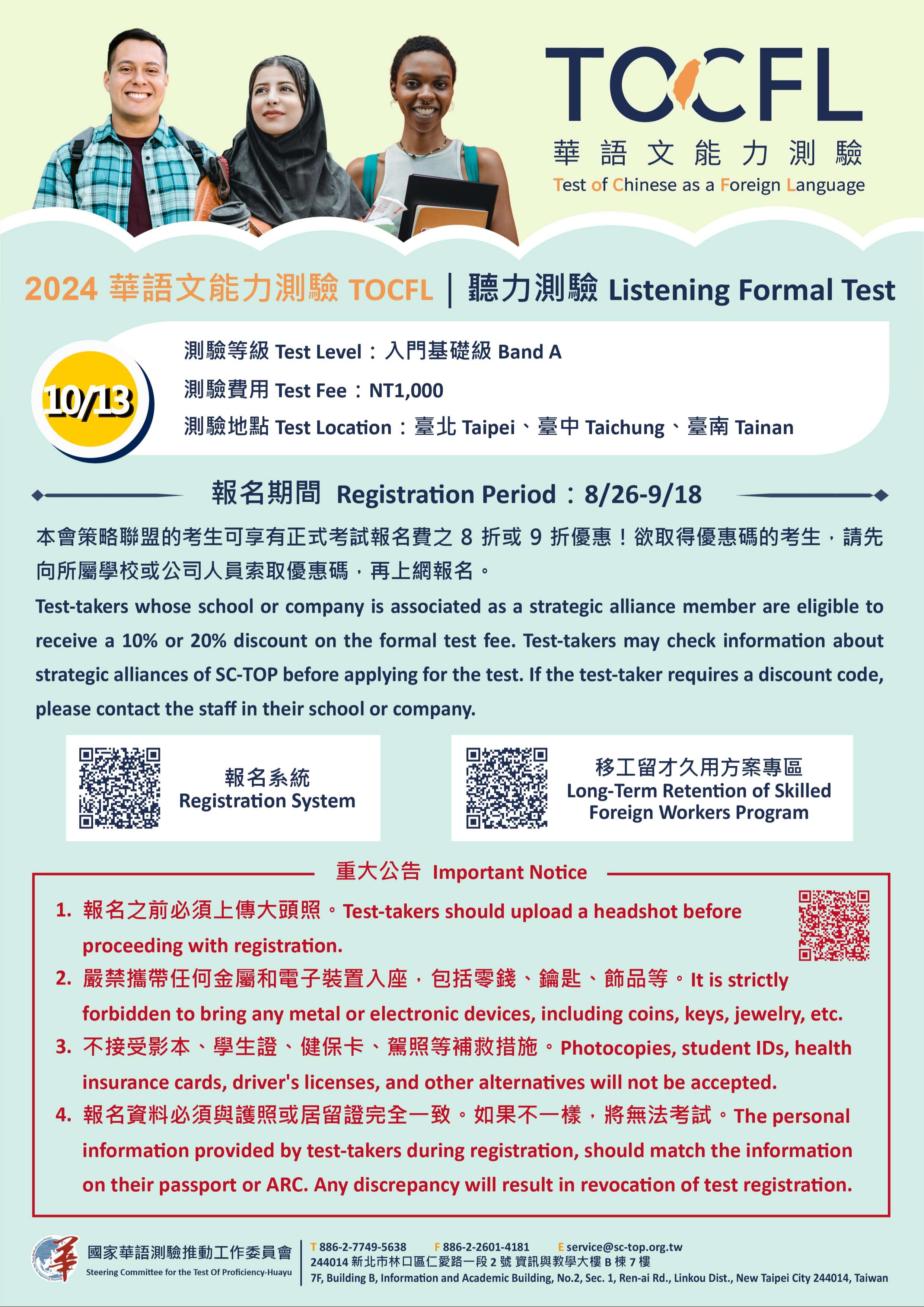 三、113年10月13日聽力測驗正式考試說明如下: (一)報名時程:同上。 (二)測驗地點:德明財經科技大學、國立中興大學及國立成 功大學,共3所考試中心。 (三)測驗等級:入門基礎級Band A。 (四)測驗費用:新臺幣1,000元。 (五)優惠訊息:本會策略聯盟所屬,個人報名費享九折優 惠;欲加入策略聯盟,請洽:02-7749-8656。 (六)為因應行政院核定2022年4月30日正式實施「移工留才久 用方案」,申請者應具備華語文能力測驗口語或聽力能力至少「基礎級」之相關規定。