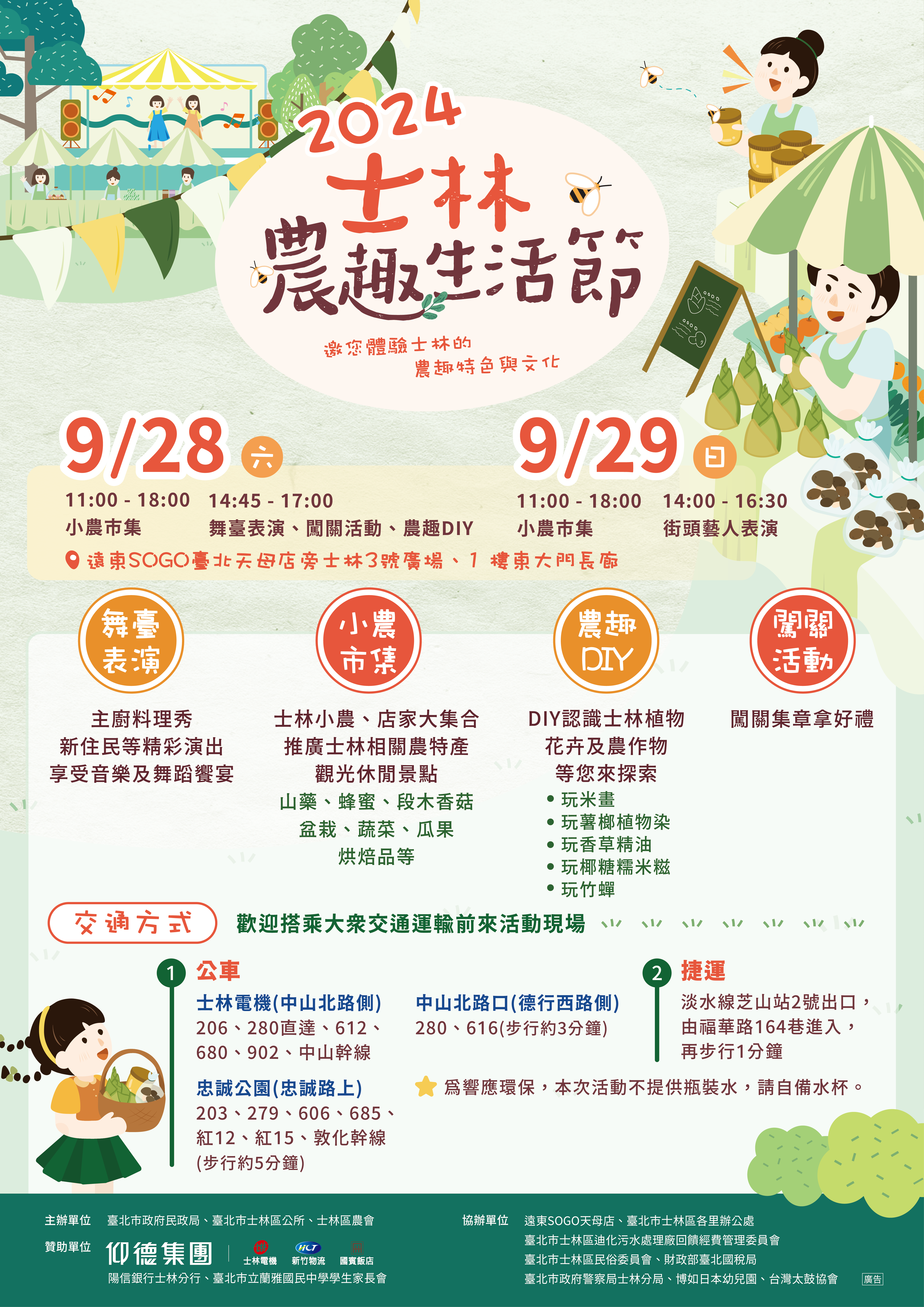 (二)內容:農趣文化,精彩無限!臺北市士林區公所將於113年9月28日(星期六)及29日(星期日)11時至18時,在遠東SOGO臺北天母店旁士林3號廣場與1樓東大門長廊首次舉辦「2024士林農趣生活節」!本次活動由士林區公所與士林區農會攜手合作,精心規劃豐富內容,邀民眾一起體驗士林的農趣特色與文化。9月28日(星期六)現