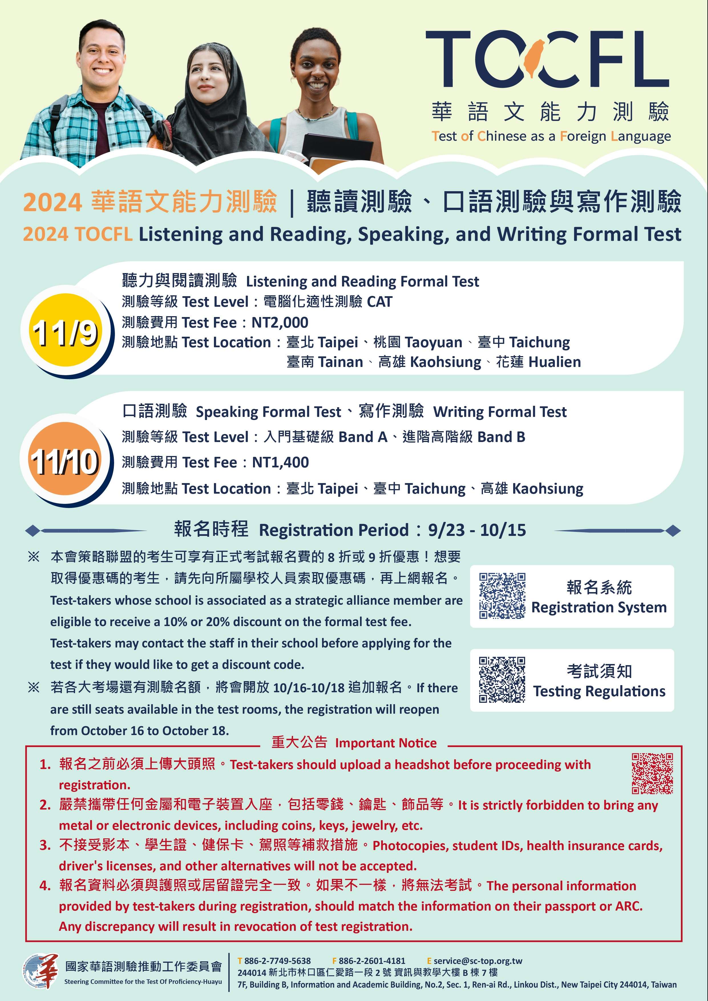 五、該會業已實施新版報名與考試規則,重大變革可詳參113年 8月7日華測字第1132000108號函(諒達)說明: (一)報名之前須上傳大頭照。 (二)僅接受憑護照或居留證入場,不接受影本或翻拍照、雙 證件如學生證、健保卡等補救措施。 (三)嚴禁攜帶任何金屬和電子裝置入座,包括零錢、鑰匙、 飾品等。 (四)個人報名資料須和護照或居留證完全一致,若有不符, 將無法參加考試。