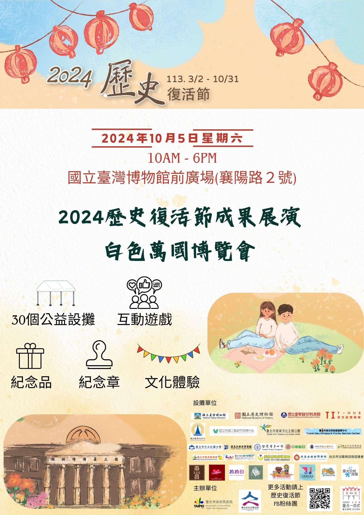 一、該區113年度基層藝文活動「2024歷史復活節:白色萬國博覽會」將於113年10月5日(星期六)上午10時至下午6時假