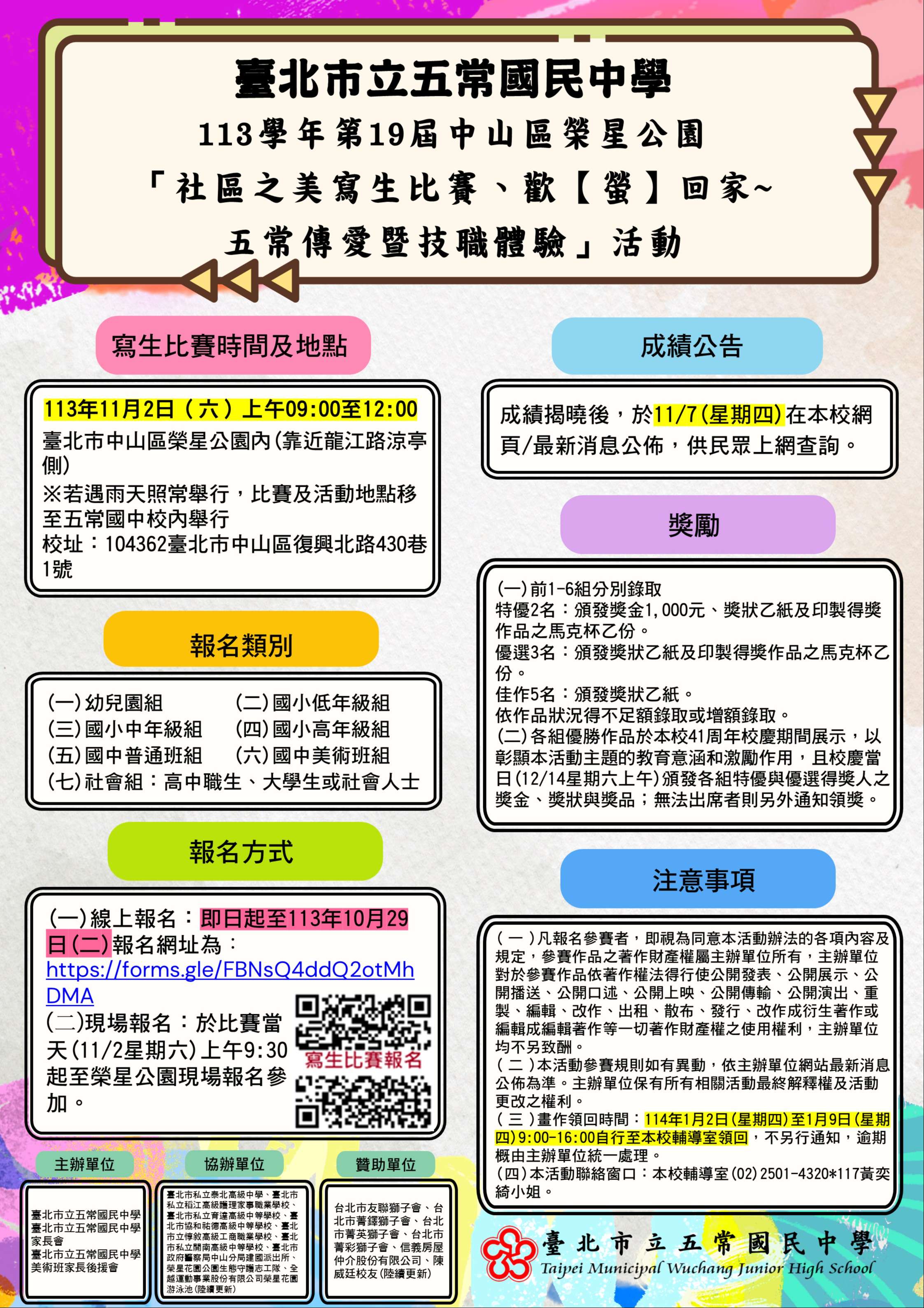 一、比賽時間:113年11月2日(星期六)早上9時至12時整。比賽地點:榮星公園內(臺北市中山區民權東路三段與龍江路口),若遇雨天照常舉行,比賽地點移至五常國中校內。
