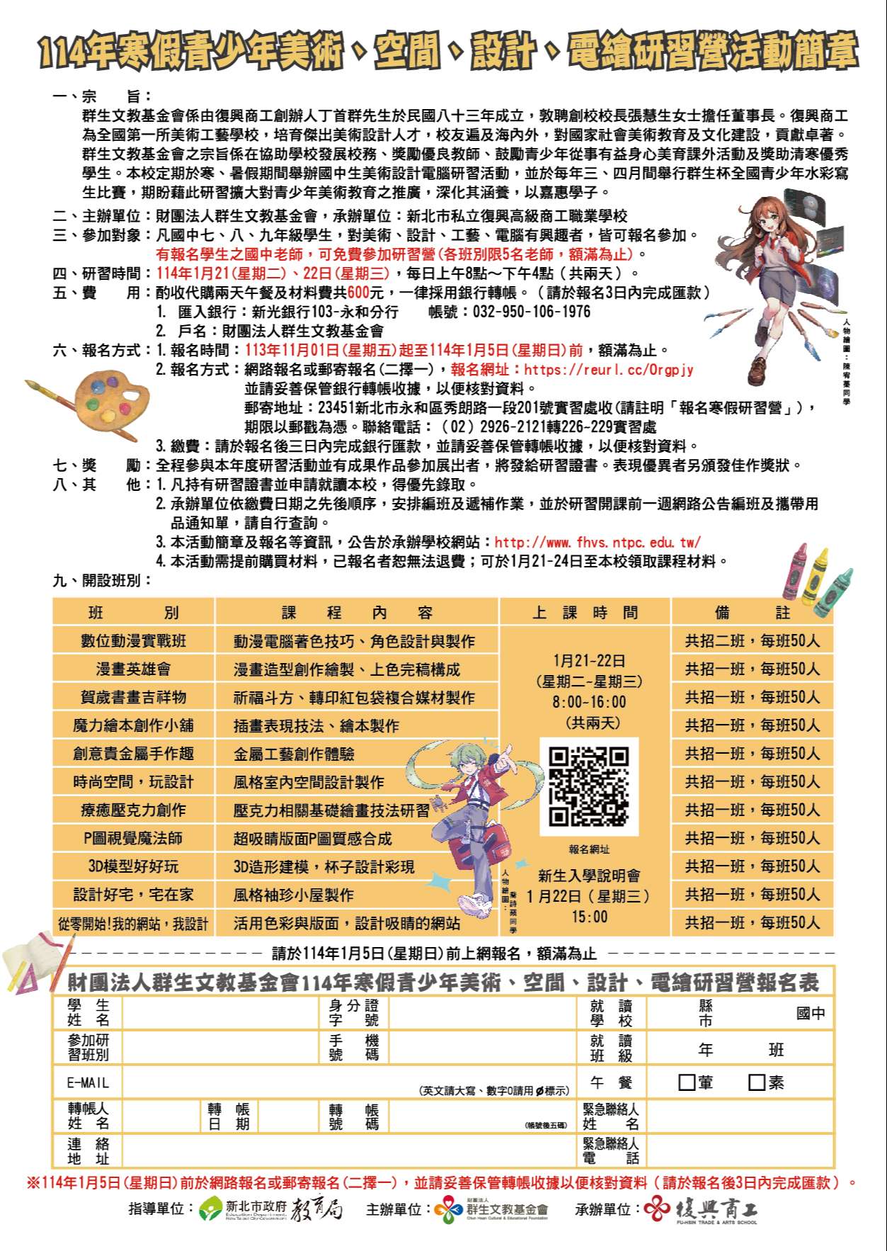 七、報名時間:113年11月01日(星期三)起至114年1月05日(星期五)前,額滿為止。任何課程相關問題,聯絡電話(02)2926-2121轉226~229。