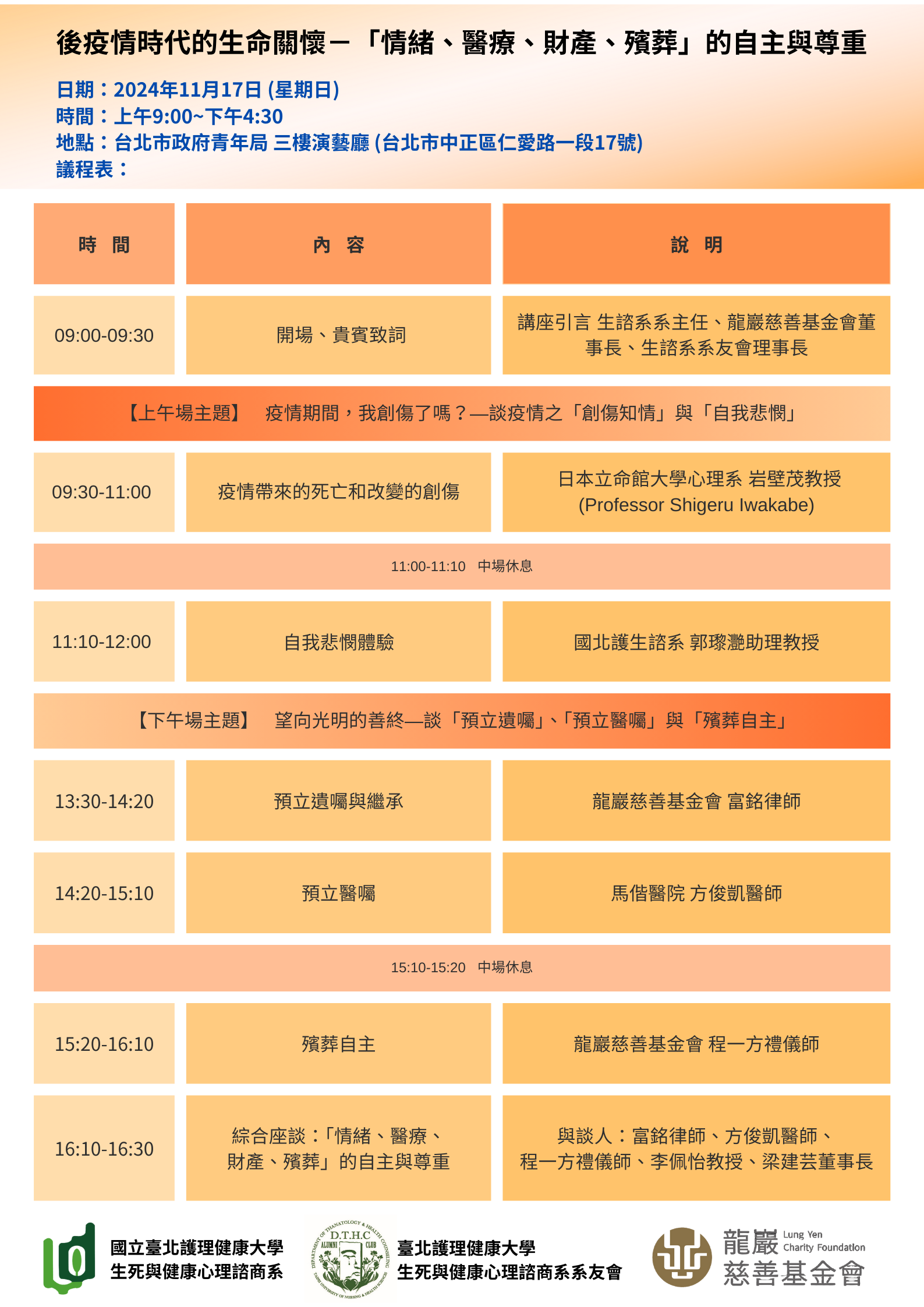 國立臺北護理健康大學生死與健康心理諮商系113年 11月17日(日)「後疫情時代的生命關懷—『情緒、醫 療、財產、殯葬』的自主與尊重」市民講座活動資訊: