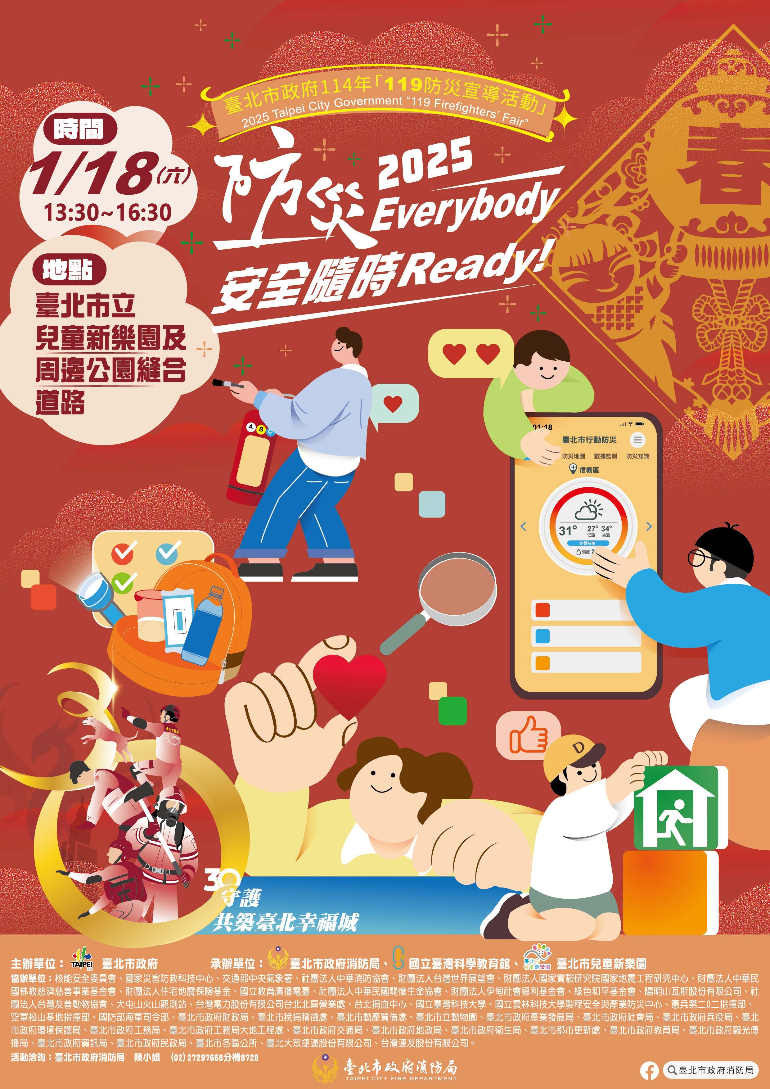 1月18日下午兒童新樂園,「防災Everybody 安全隨時Ready!」,互動闖關學防災,消防文創手作樂,火災求生大作戰,歡迎您來挑戰,闖關集點就送精美禮品,119防災宣導活動,全家大小一起出來玩!
