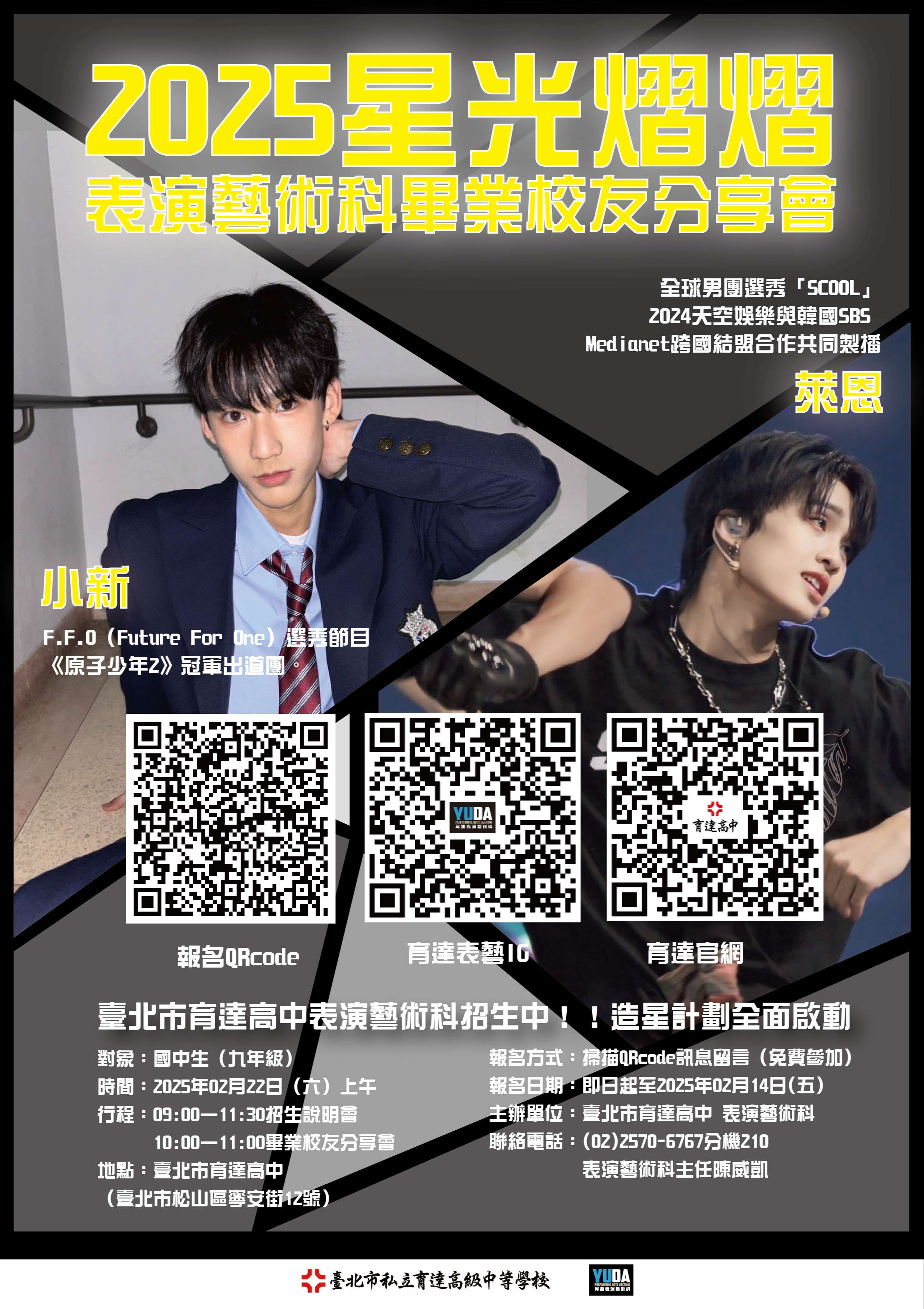 三、活動訊息:(一)活動費用:全部免費(二)活動對象:國中生(九年級) (三)活動時間:2025年02月22日(星期六)09:00—12:00 (四)活動地點:臺北市私立育達高中(臺北市松山區寧安 街12號)(五)報名網址:https://reurl.cc/eGbyKQ(六) 活動聯絡人:表演藝術科主任陳威凱,如有問題請洽專 線:(02)2570-6767#210