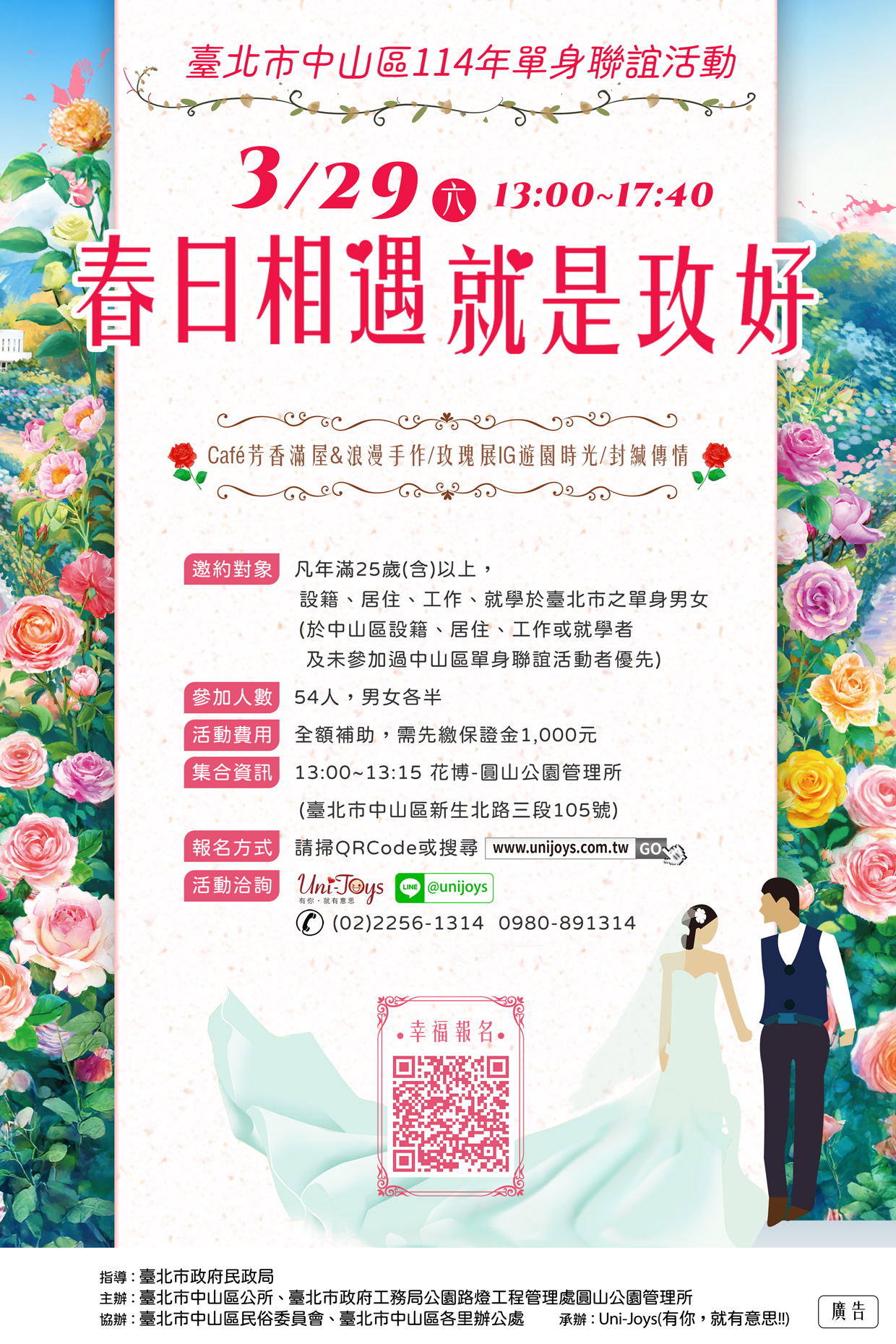 臺北市中山區公所『春日相遇 就是玫好』單身聯誼活動,將於114年3月29日(星期六)13時至17時40分假臺北玫瑰園及花博新生園區舉辦,活動名額為男、女各27人,共54人,歡迎年齡 25歲以上設籍於本市或於本市居住、工作、就學之單身者踴躍報名參加(於中山區設籍、居住、工作或就學者及未參加過中山區單身聯誼活動者優先),活動 詳情請參閱本所官網(https://zsdo.gov. taipei/)或電 洽(02)25031369分機593鍾小姐。