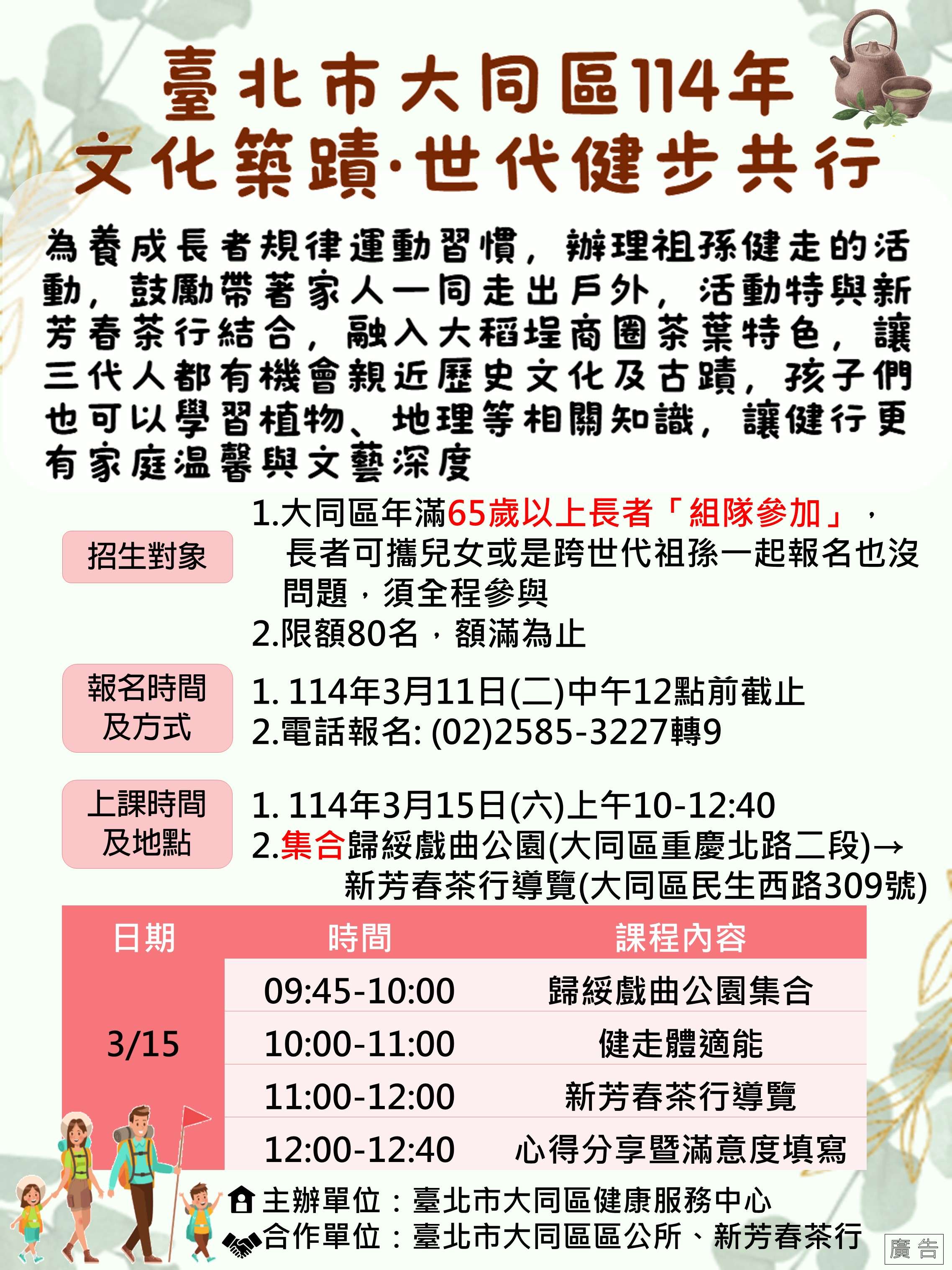 二、為促進長者走出戶外、倡導敬老氛圍、增進世代融合,本 中心擬於114年3月15日(星期六),辦理「文化築蹟‧世代 健步共行」活動,請貴校運用多元管道(公佈欄、電子媒 體、社群網站、部落格等),協助推廣宣導,並鼓勵貴校同 仁、學生及家長踴躍參加,活動資訊如下: (一)招生對象:大同區65歲以上長者「組隊參加」,長者作 為小隊長攜兒女或是跨世代祖孫一起報名,須全程參 與,限額80名,額滿為止。 (二)活動時間:114年3月15日(星期六),上午10:00至12: 40。(三)活動地點:歸綏戲曲公園(臺北市大同區重慶北路2 段)。(四)報名方式:即日起至3月11日(星期二)中午12點止,採電 話報名。