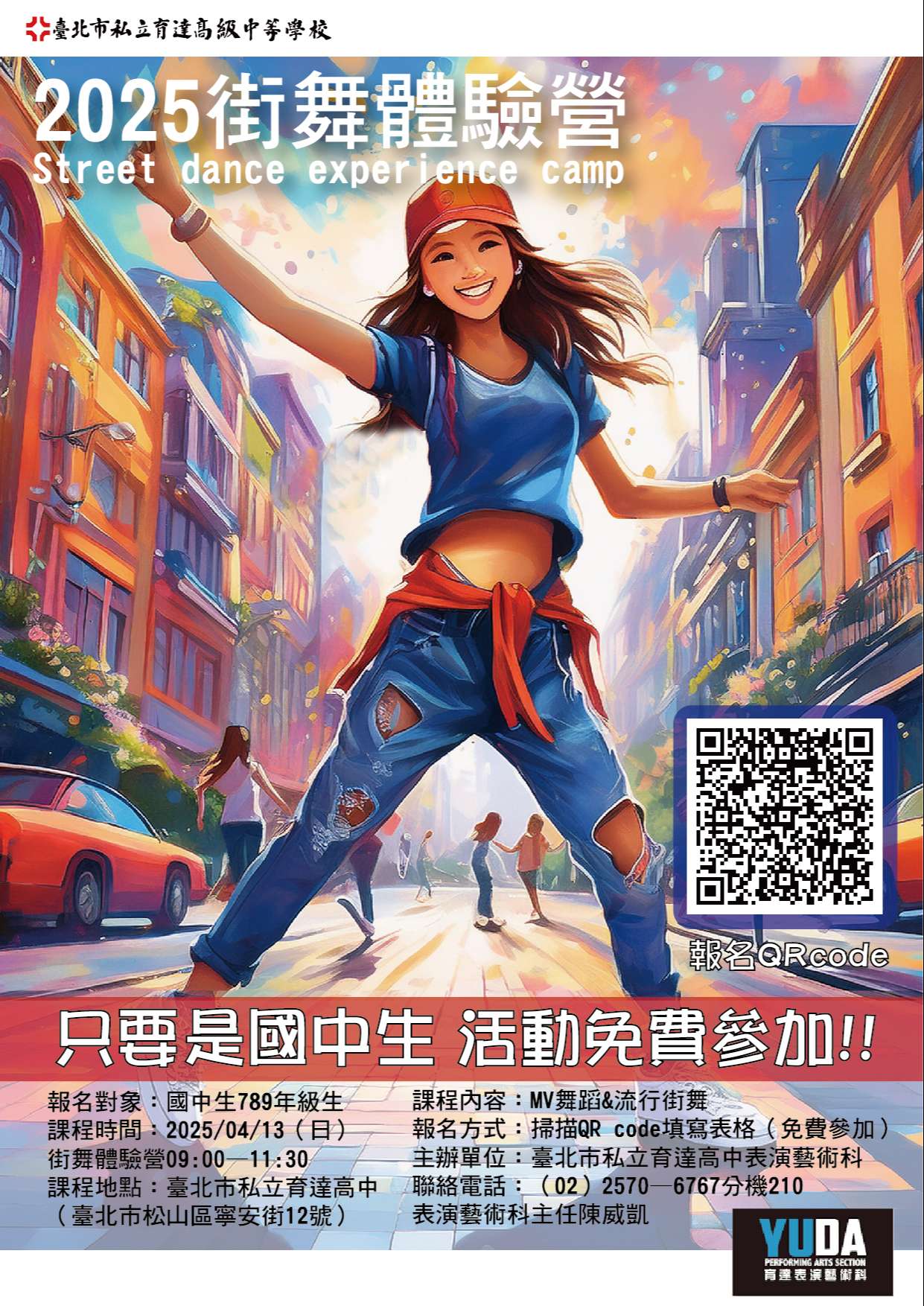 一、育達高中以掌握趨勢,培育達人作為宗旨。陶冶專業表演藝術(舞蹈、劇劇、綜藝)人才,舉辦畢業公演、組展、班展及活動競賽,提升學生表演實力,配合展演實務課程,奠定其發展之基礎,並透過產學合作,掌握業界與流行的脈動,增進學生的專業技能與涵養。本次活動特邀本科汪寧柔老師教授流行街舞課,讓有興趣的國中生,更夠體驗表藝科的課程與學習訓練,開發及訓練身體,並探索未來志向。