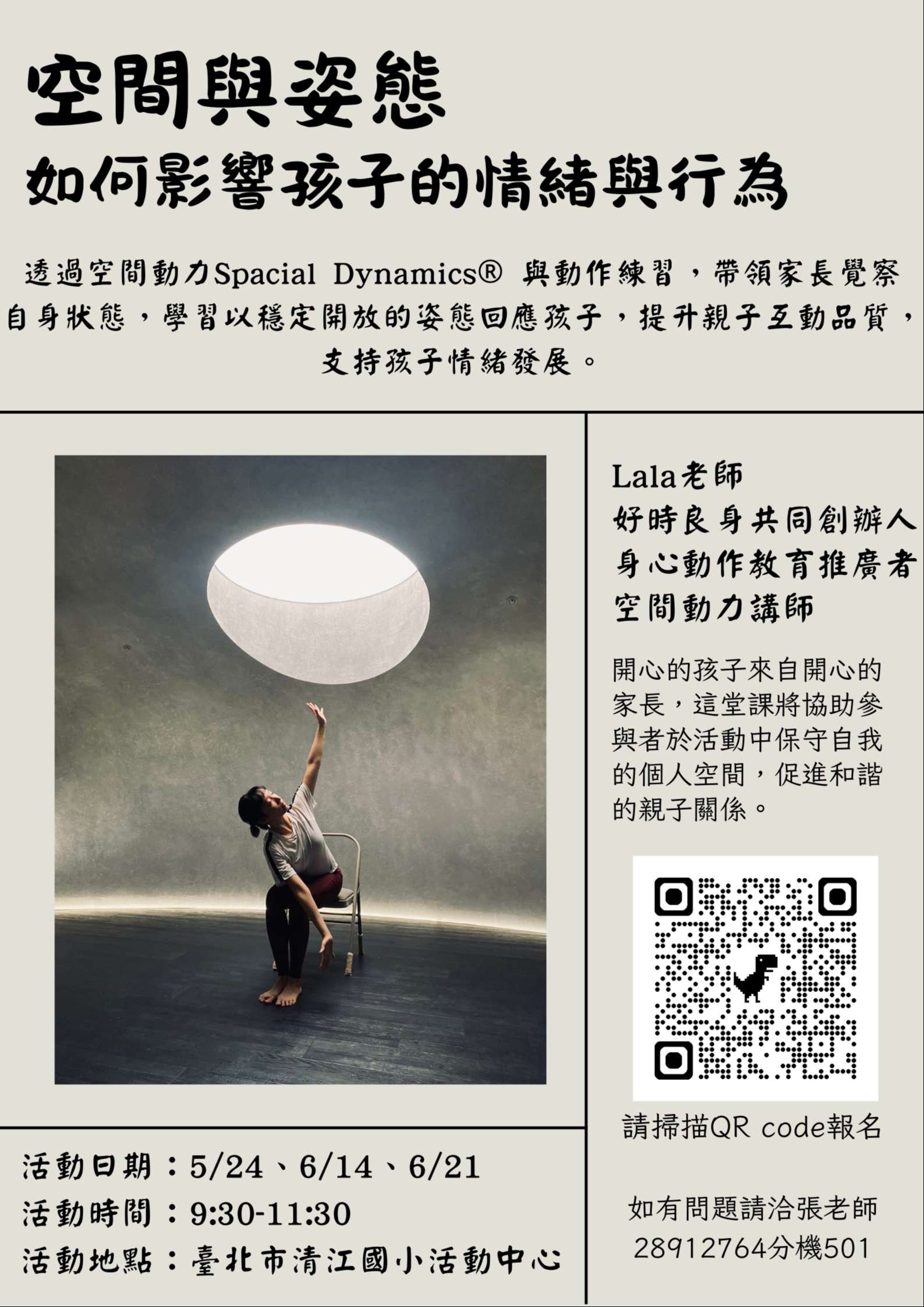 二、主題:空間與姿態-- 如何影響孩子的情緒與行為 (一)講師:李忻怡 (Lala) 老師 (二)日期:114年5月24日、6月14日、6月21日(星期六) (三)時間:上午 9:30-11:30 (四)地點:清江國小活動中心