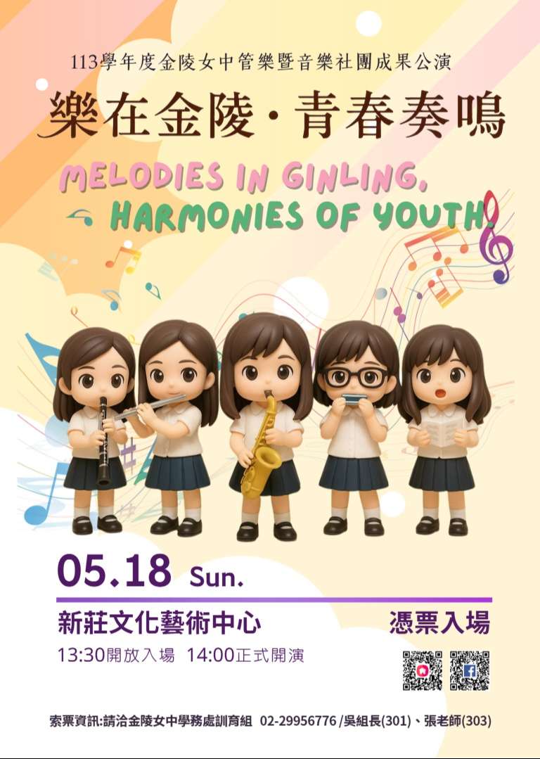 四、表演團隊:金陵女中管樂團、合唱團、曲笛社、口琴獨奏(全國學生音樂比賽特優第一名)、英語歌唱(本校雙語精進班榮獲新北市英唱比賽特優)、欣響室內管樂團。