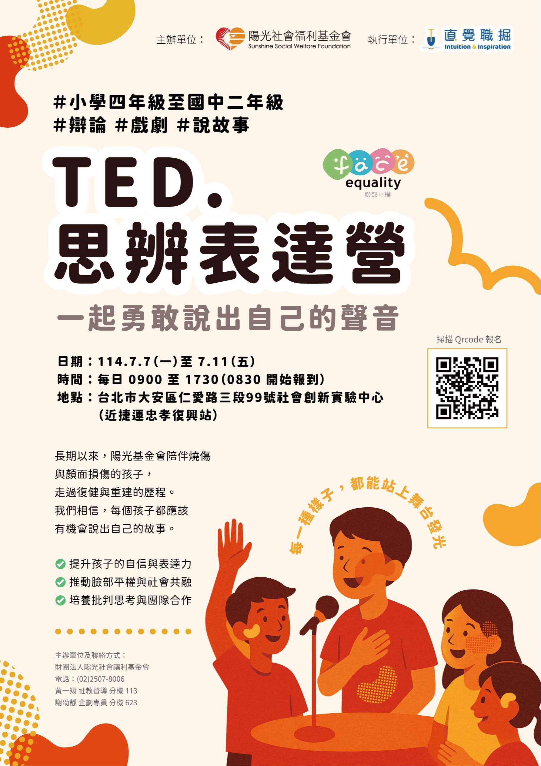 二、為使兒少能更關注日常生活中與自己、與他人相關的事 物,不僅更願意表達,且能自在說出自己的想法,建立其 自信、表達力與同理心,本會攜手「直覺職掘」將於7月份 共同辦理「盛夏OPEN MIND 表達OPEN MIC---TED.思辨表達營」,以思辨訓練結合戲劇教育,透過小組討論、辯論演 練、街訪實作與舞台發表,引導兒少勇敢發聲、理解多 元,並從中認識容貌焦慮與外貌歧視等議題。 三、本營隊採共融設計,招收來自陽光與非陽光服務之不同背 景學生共30名,期盼透過混齡共學與平等交流,打造尊重 差異的學習場域。