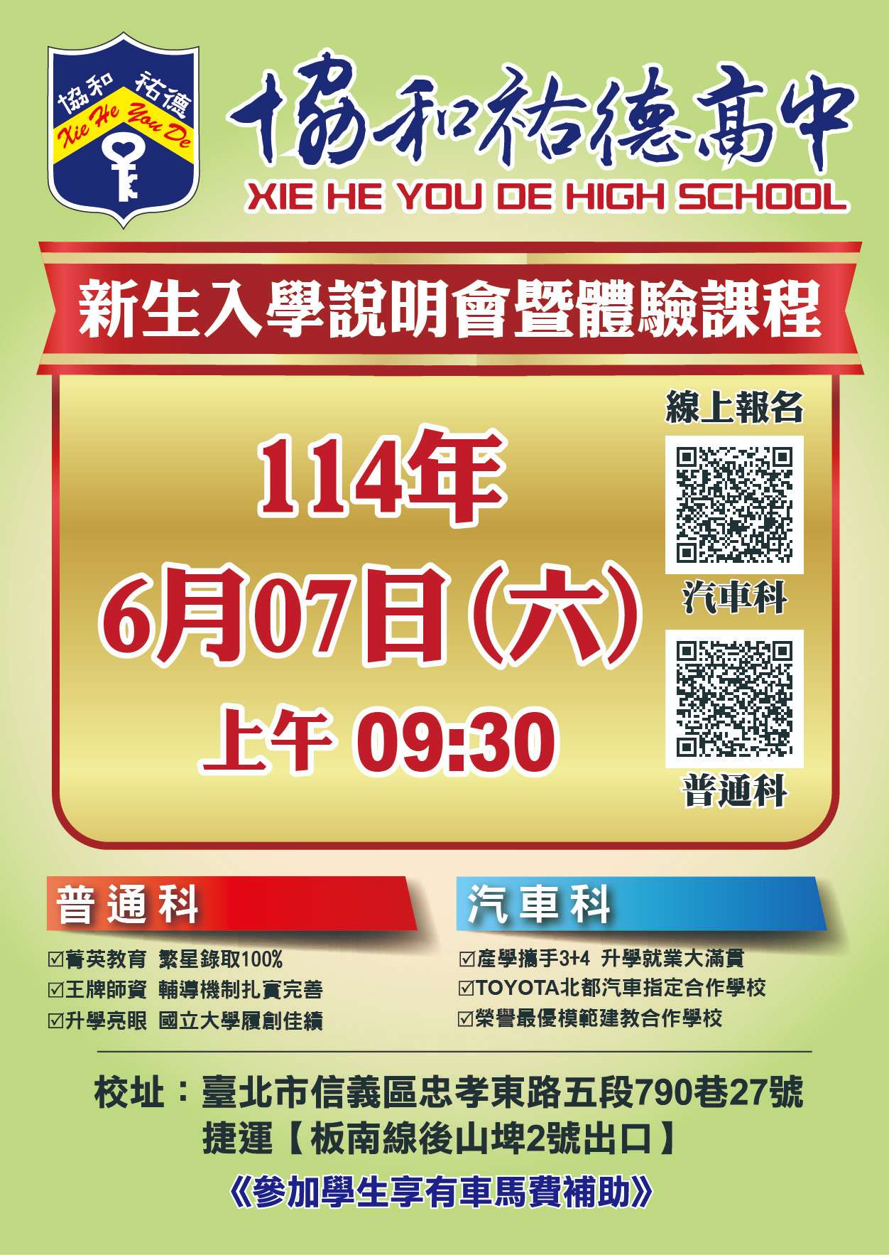 二、活動共計兩大主題: (一)普通科:1.優勢說明:王牌師資群(補教/前三志願高中名 師)、免補習省下補習費、扎根品德教育。2.升學進路、 教學特色說明:普通科大學繁星100%錄取第一志願,並有 3分之1錄取國立大學。本校普通科小班制、精緻化教學 並加以個別輔導,讓家長放心、學生開心。 (二)汽車科:1.優勢說明:建教實習年薪30萬以上、畢業直升 東南科技大學、成為TOYOTA北都汽車正式員工。2.階梯式建教合作說明:高一、二針對專業及技能在校打底,高 三再由車廠到校選材,本校建教合作制度健全,榮獲最 優模範建教合作學校。