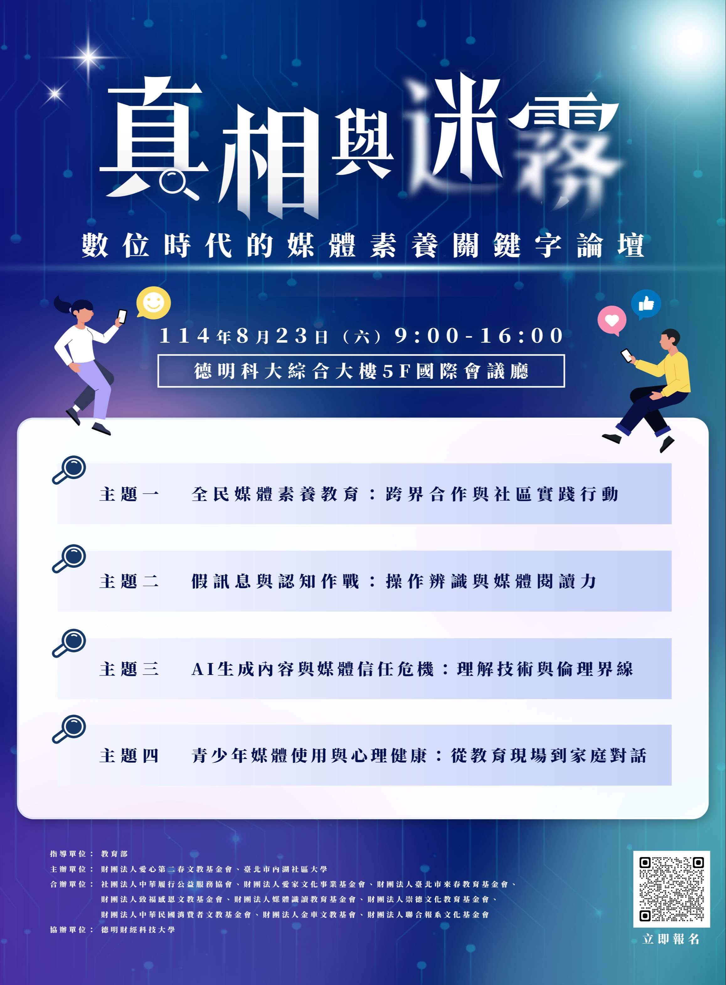 一、本論壇旨在凝聚教育、科技、心理與公民社會的力量,透 過多元觀點對話,探索媒體素養在大眾認知、AI內容、青 少年發展與社區行動中的關鍵角色。期望喚起全民關注媒 體環境變遷,共建健康、理性的資訊社會。