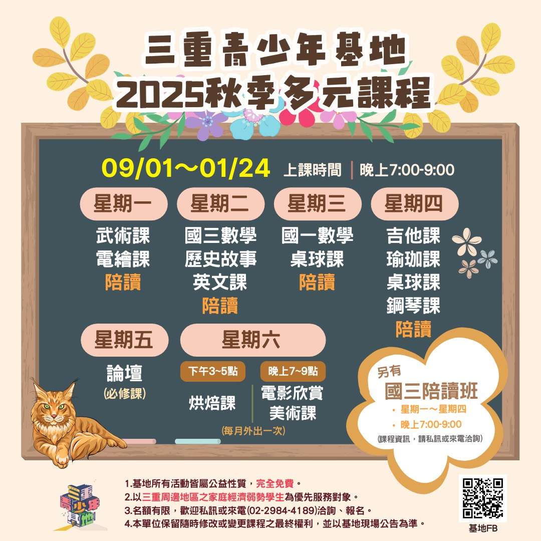 一、三重青少年基地2025秋季多元課程開課期間為9/1(一)~1 /24(六)。除周五晚上的「論壇」為必修課程,其他課程學 生自由選課,課表如附件。