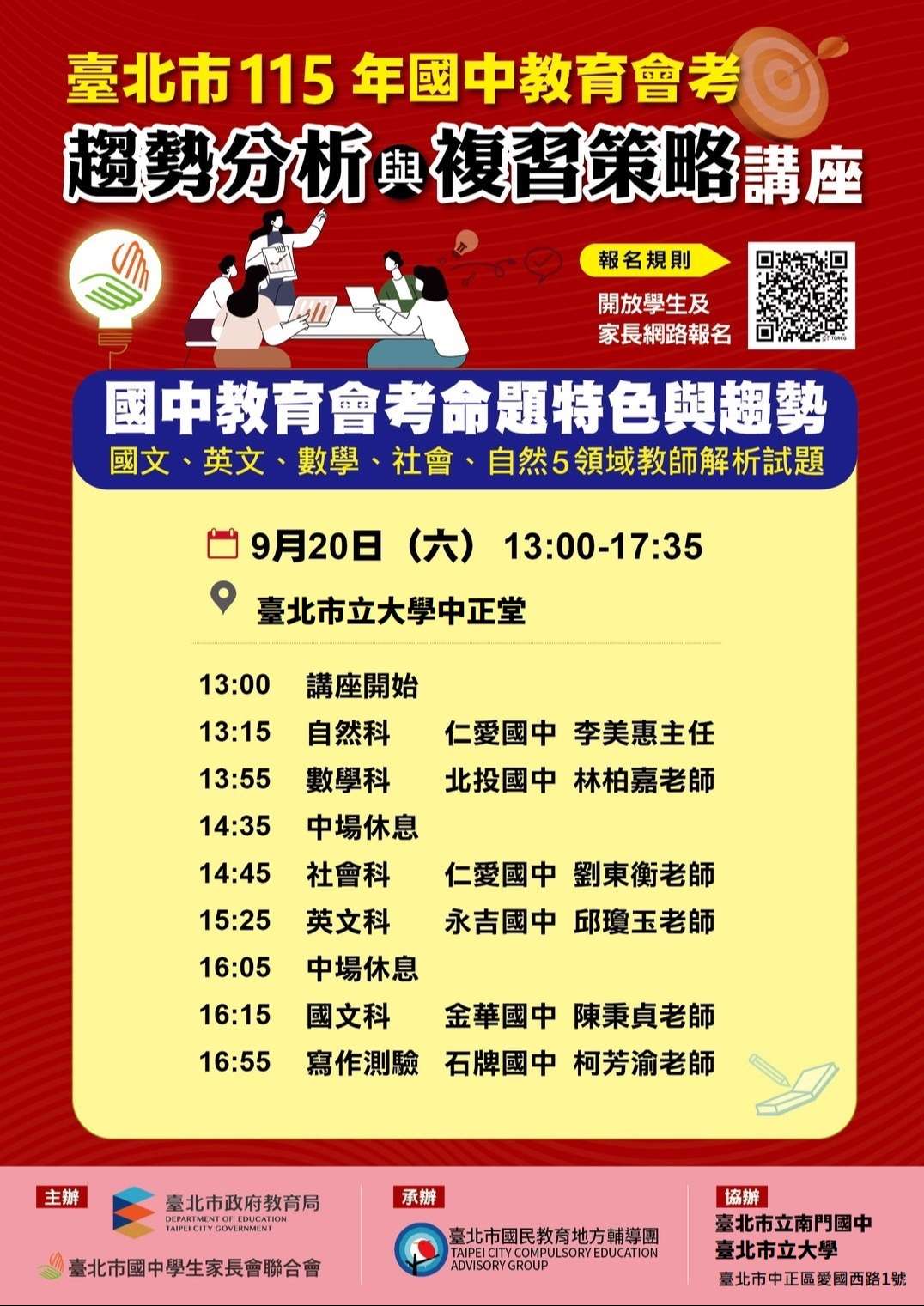 二、旨揭活動為本局參與主辦之年度重要教育活動,因報名踴 躍,原場地無法容納,為利活動順利進行,爰辦理變更活 動地點。 三、活動辦理相關資訊如下: (一)採實體演講方式:邀請國文(含寫作測驗)、英語、數 學、社會及自然5領域教師解析試題,並開放學生及家長 提問及雙向交流。 (二)活動對象:臺北市國中學生及家長(9年級優先、學生為 主,由於場地容量因素,僅限1為家長陪同)。 (三)活動時間:114年9月20日(星期六)13時起至18時止。(四)活動地點:臺北市立大學博愛校區中正堂。 (五)報名方式:由臺北市國中學生家長聯合會負責,請於114 年9月18日前至下列連結網址填寫報名表,若有報名相關問題,請逕洽貴校學 生家長會。 (六)本次講座同步全程錄影,於活動結束後,上傳至臺北酷 課雲「酷課OnO線上教室」之「國中會考」專區,以提供 學生和家長觀看。