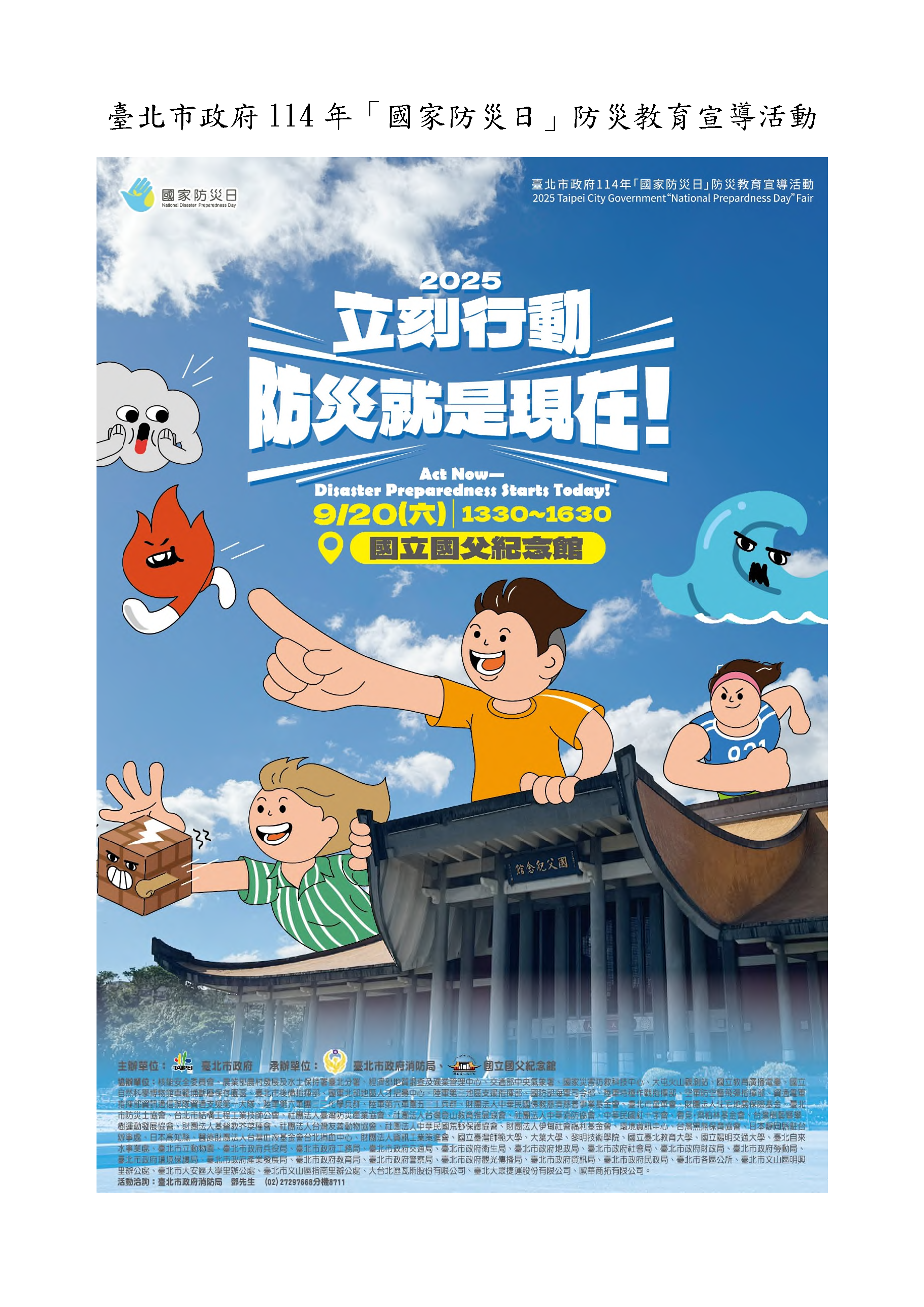 9月20日下午國父紀念館,國家防災日活動「立刻行動防災就是現在!」,互動闖關學防災,防災手作樂趣多,歡迎您
