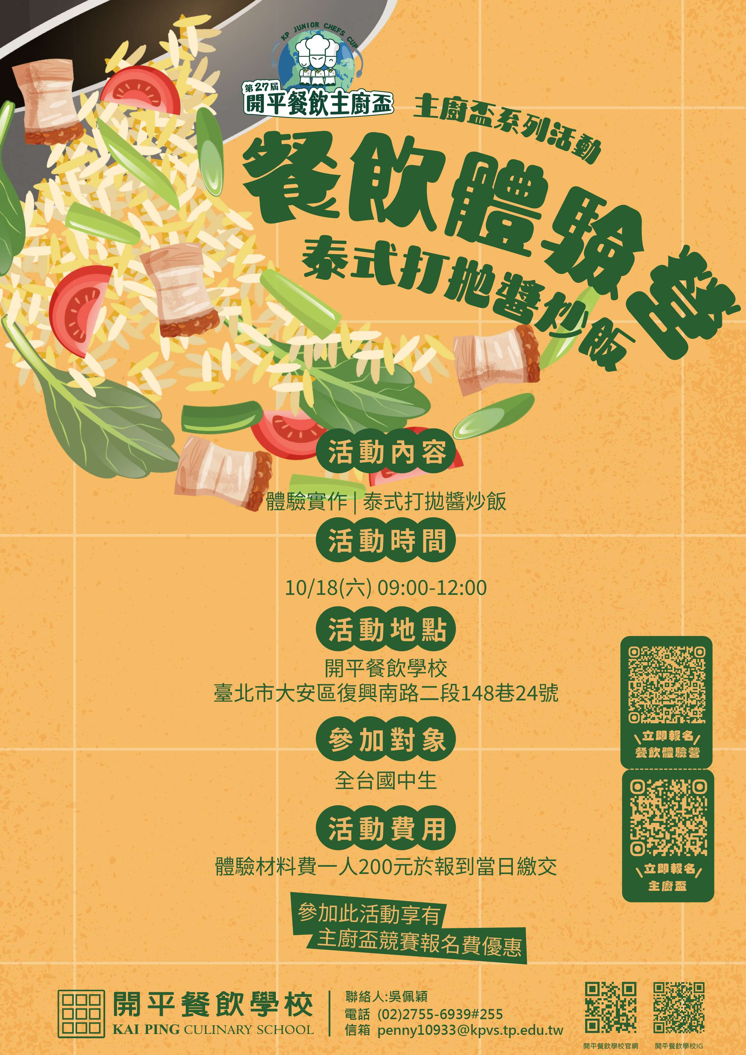 一、本次活動結合第27屆主廚盃國中競賽活動,透過「泰式打 拋醬炒飯」實作體驗更加了解技職教育,以料理展現自 我、創造未來無限可能。