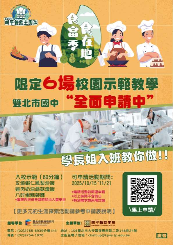 一、為推廣餐飲教育與實作體驗,開平餐飲學校辦理「第27屆 主廚盃」系列活動,規劃限定6場校園示範教學,邀請雙北 市國中學生一同進入廚藝實作的現場,透過專業師生的親 身示範與帶領,體驗餐飲的魅力與技藝。