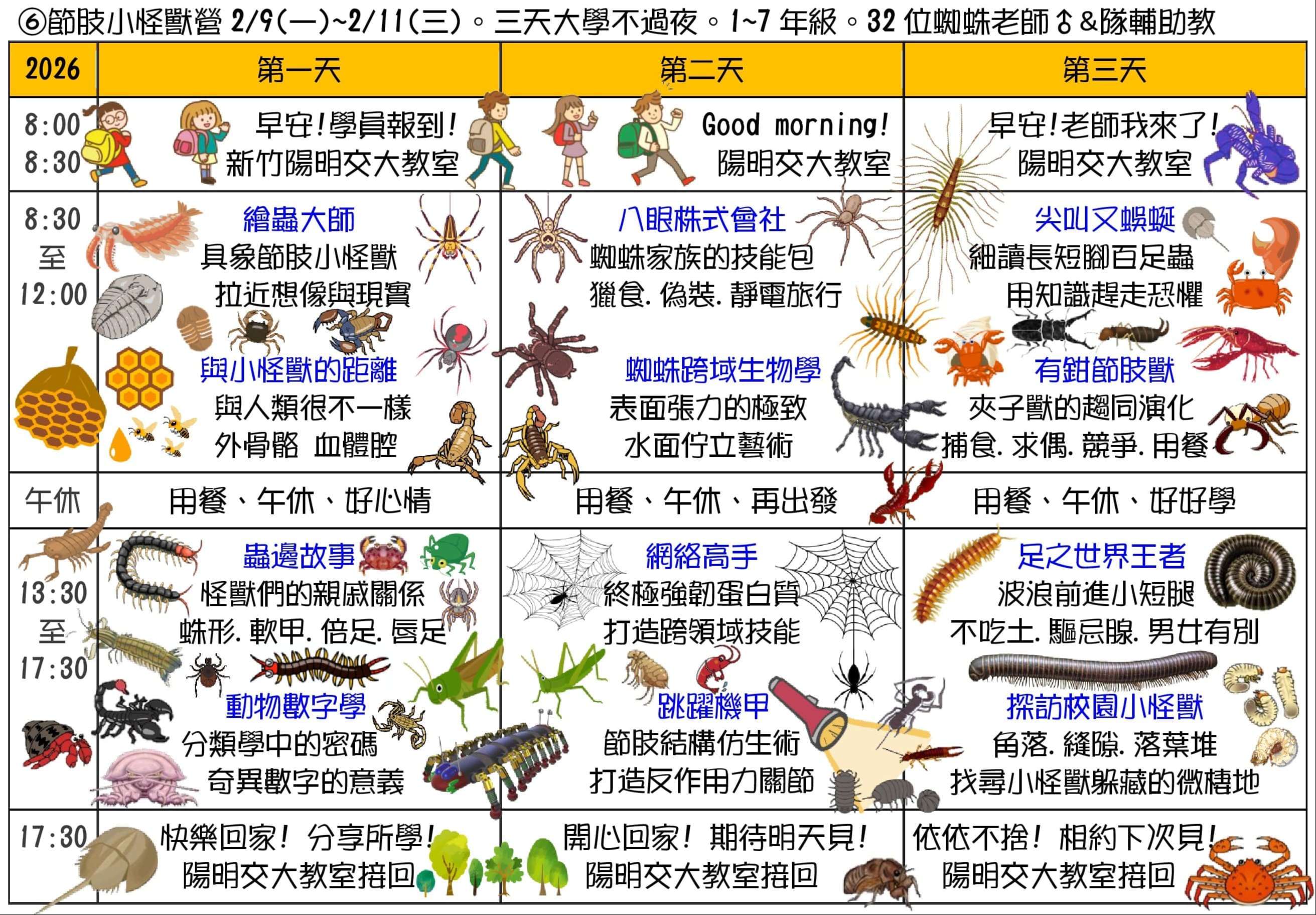 二、課程主題:①蘭陽山野求生營(5天4夜)、②小琉球海龜營(5天4夜)、③宜蘭生態農場營(3天2夜)、④TPE博物館生態營(3天外出不過夜)、⑤屏東柚園攀樹營(3天外出不過夜)、⑥節肢小怪獸營(3天大學不過夜)、⑦池上單車生態營(4天3夜)。