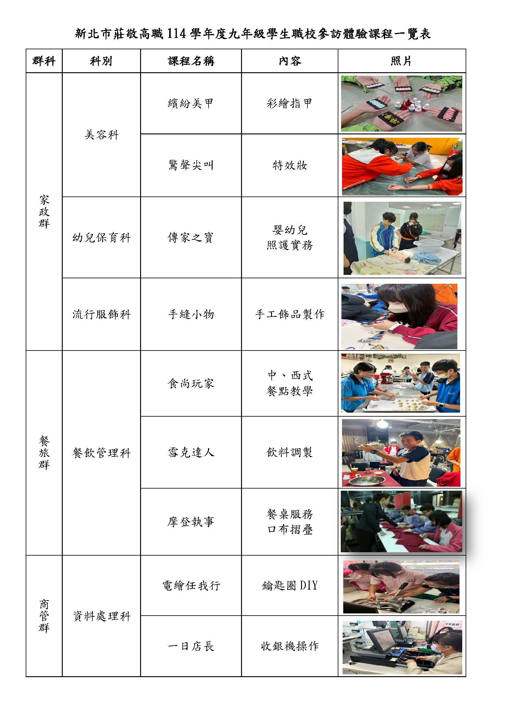 一、為協助九年級學生在生涯發展過程中,透過實地莊敬高職參訪,了解不同職群的課程主題與職場特質,以利未來生涯發展抉擇之參考。