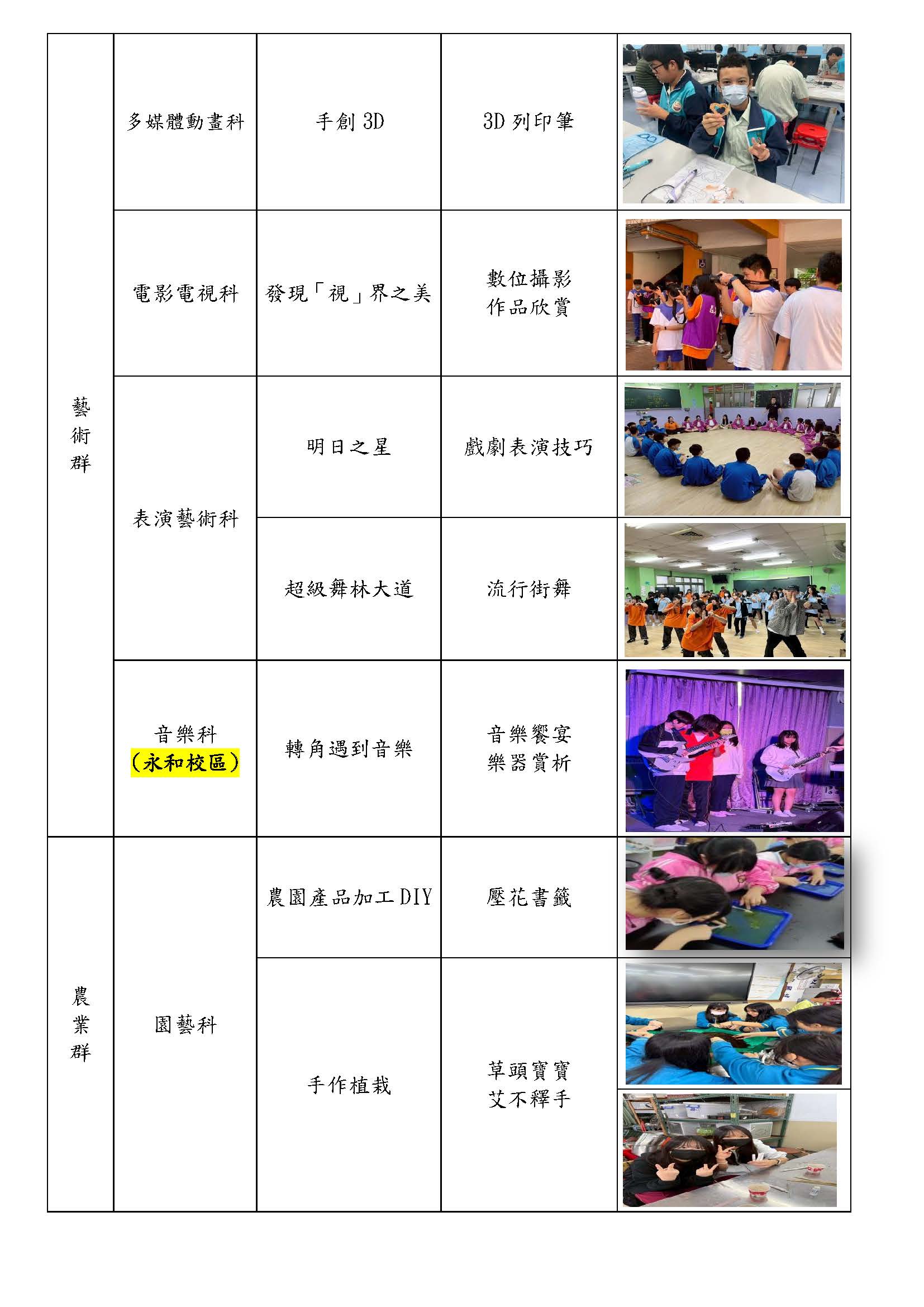 電視科、音樂科、多媒體動畫科;農業群-園藝科、動力機械群;汽車科;普通科。
