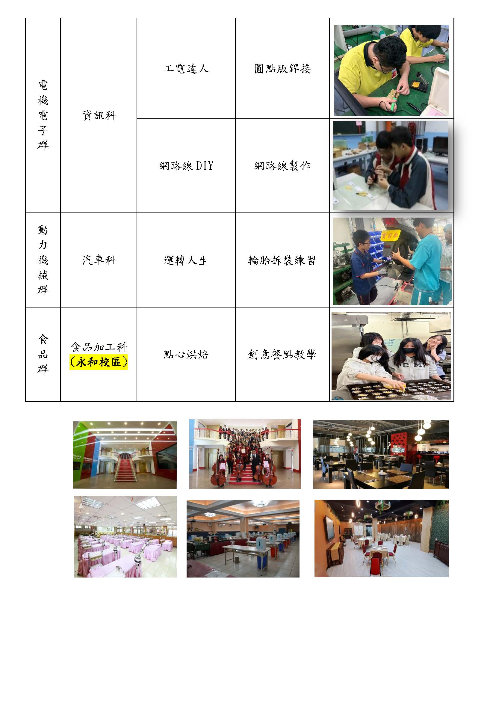 三、本校辦理建教合作班:設有餐飲科、資訊科、美容科、汽車科,合作廠商均為五星級飯店或上市櫃知名企業,汽車科知名合作廠商:台北捷運、北都豐田Toyota、裕隆Luxgen、新凱汽車Volvo、匯豐汽車Mitsubish等。
