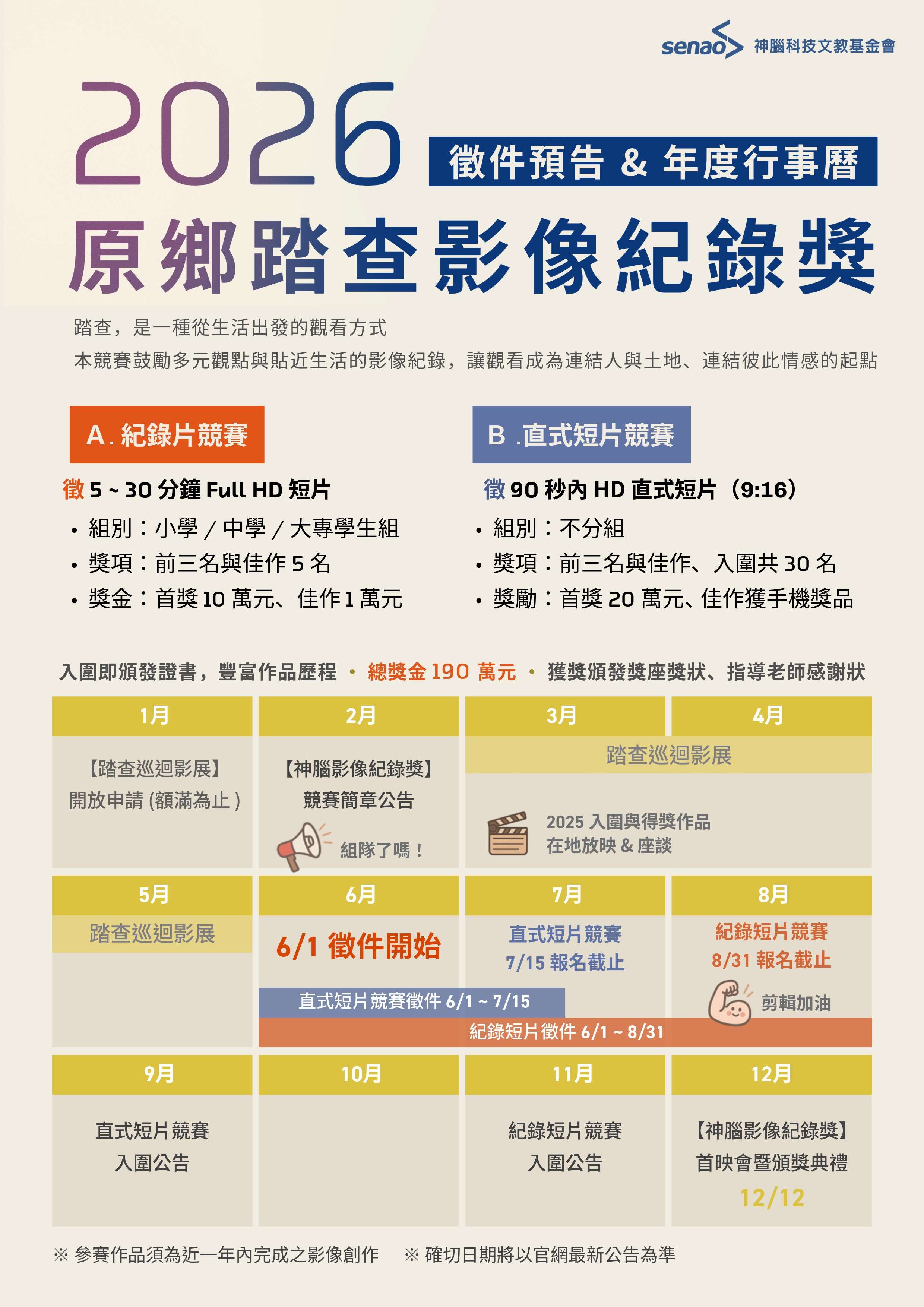 該會預計於 115 年 6 月 1 日起辦理「2026 神腦原鄉踏查影像紀錄獎」徵件。本屆徵件包含: