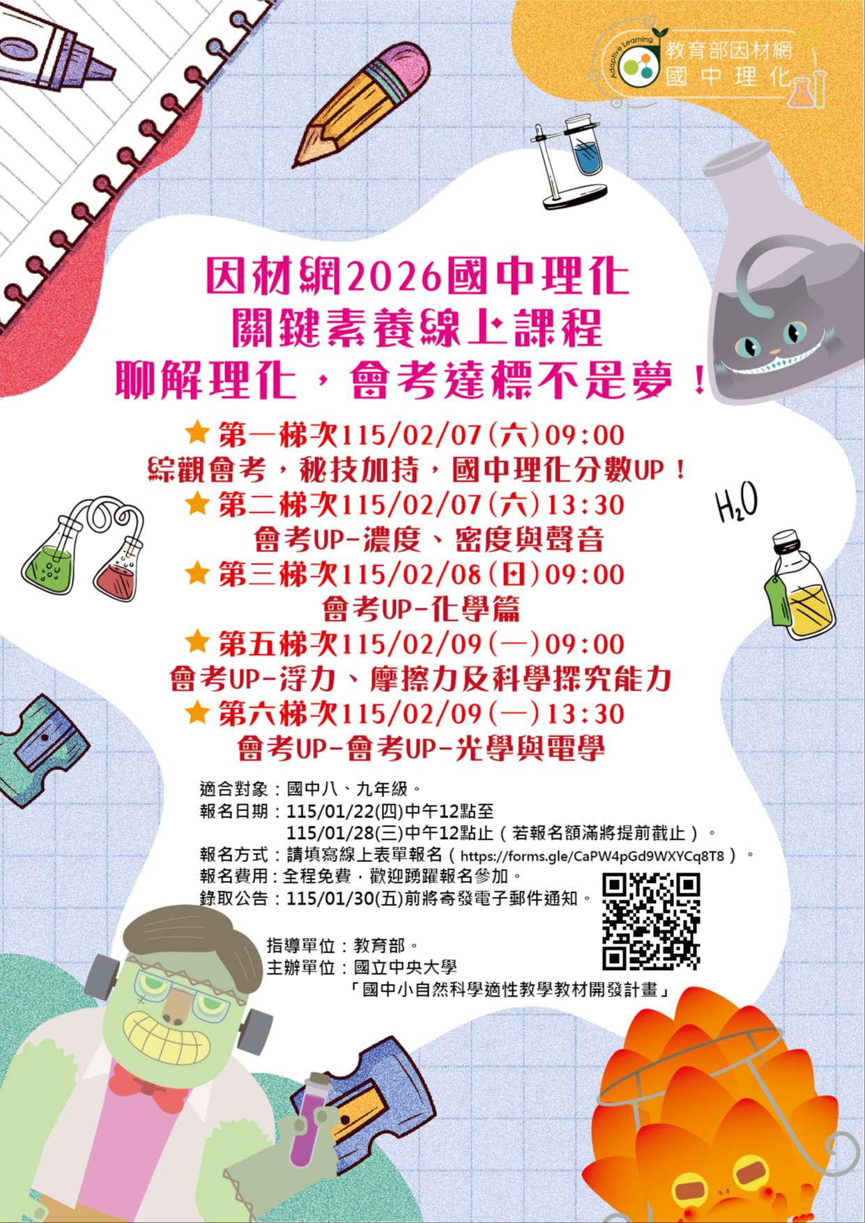 (一)課程日期: 1、第一梯次為115年2月7日(六)綜觀會考,秘技加持, 國中理化分數UP!。 2、第二梯次為115年2月7日(六)會考UP-濃度、密度與 聲音。3、第三梯次115年2月8日(日)會考UP-化學篇。 4、第四梯次115年2月9日(一)會考UP-浮力、摩擦力及 科學探究能力。 5、第五梯次115年2月9日(一)會考UP-光學與電學。