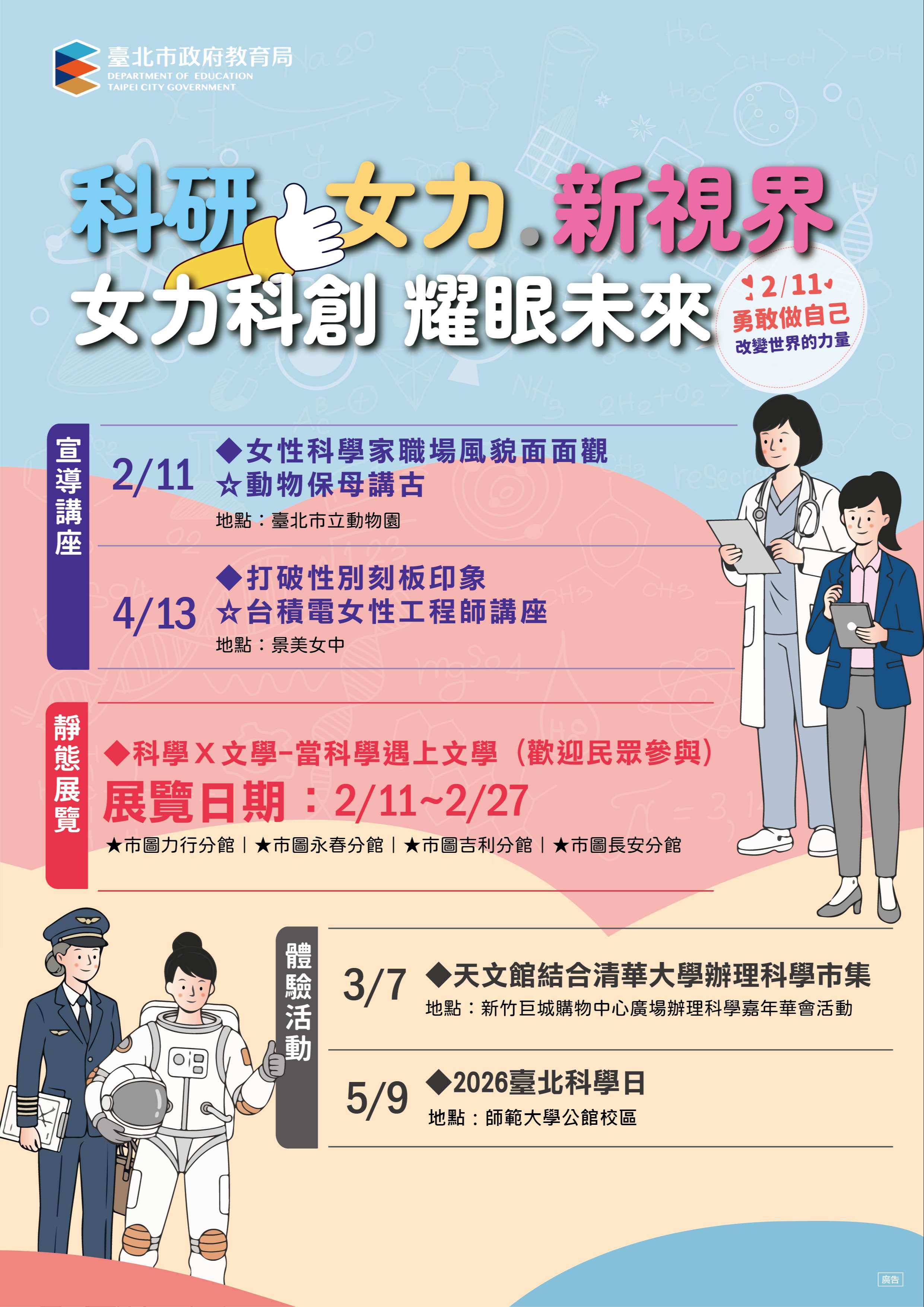 二、為響應國際女性科學日,臺北市教育局自2月11日起辦理 「2026臺北市女性科學日」系列推廣活動,以「科研.女 力.新視界」為主題,串聯動物園、圖書館、天文館及高 中校園等多元學習場域,邀請女性科學與科技工作者走進 第一線教育現場,透過宣導講座、體驗活動及主題書展等 多元形式,分享真實職涯經驗,鼓勵女孩勇於探索科學與 科技領域的多元可能。